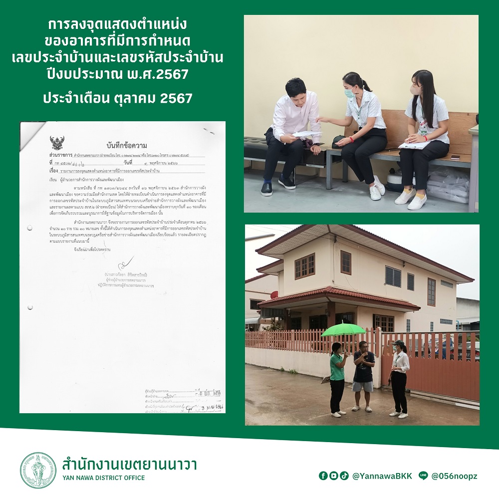 2 | ลงจุดแสดงตำแหน่งของอาคารที่มีการกำหนดเลขประจำบ้านและเลขรหัสประจำบ้าน ประจำเดือนตุลาคม 2566 จำนวน 10 ราย | 7.00 | 01-10-2024 | 31-10-2024 |