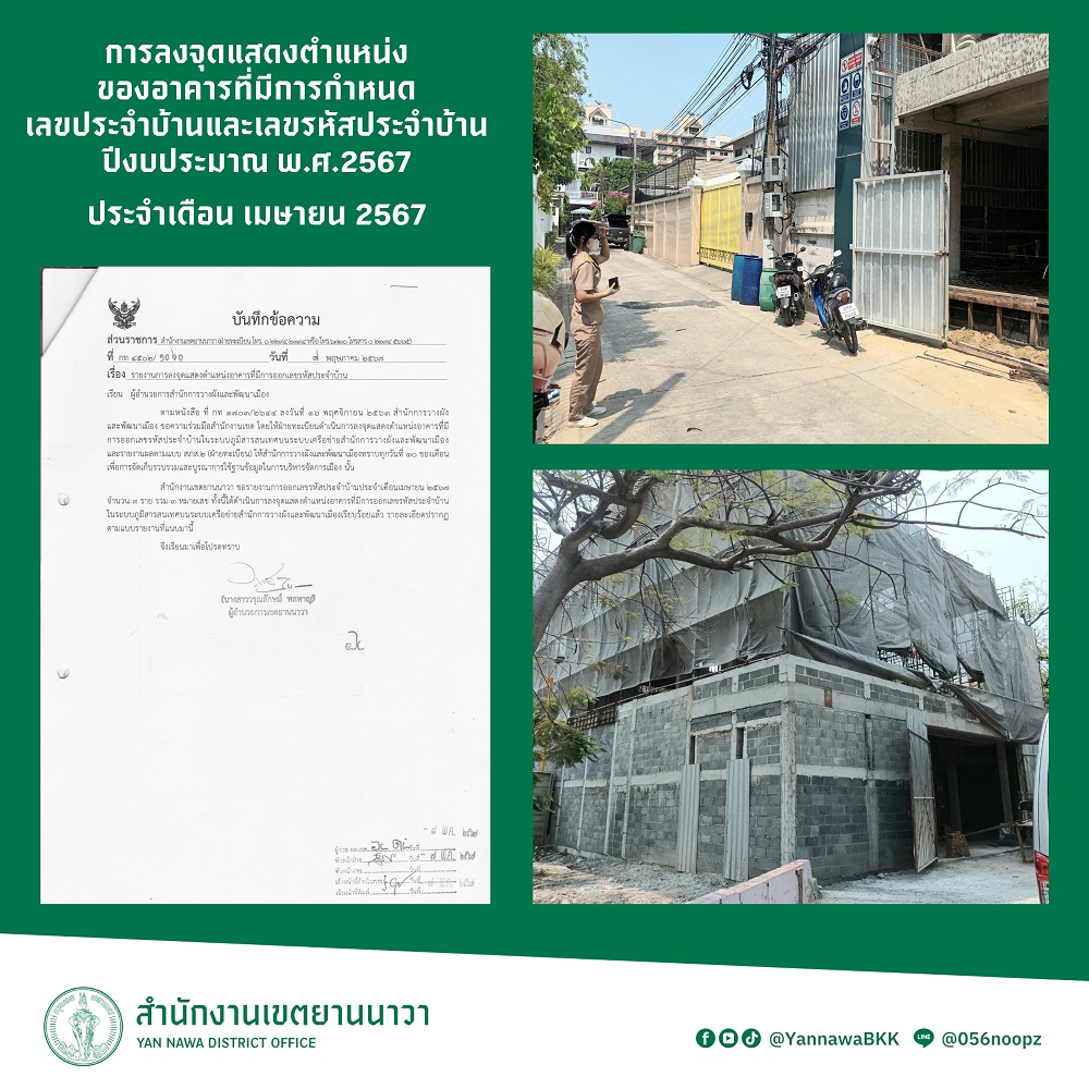 8 | ลงจุดแสดงตำแหน่งของอาคารที่มีการกำหนดเลขประจำบ้านและเลขรหัสประจำบ้าน ประจำเดือนเมษายน 2567 | 7.00 | 01-04-2024 | 30-04-2024 |