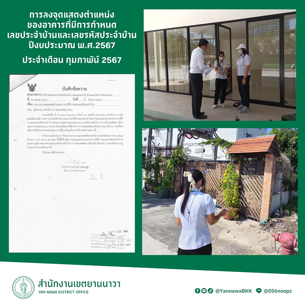 6 | ลงจุดแสดงตำแหน่งของอาคารที่มีการกำหนดเลขประจำบ้านและเลขรหัสประจำบ้าน ประจำเดือนกุมภาพันธ์ 2567 | 7.00 | 01-02-2024 | 29-02-2024 |