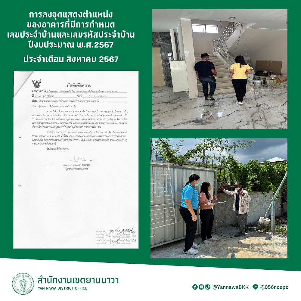 12 | ลงจุดแสดงตำแหน่งของอาคารที่มีการกำหนดเลขประจำบ้านและเลขรหัสประจำบ้าน ประจำเดือนสิงหาคม 2567 | 9.00 | 01-08-2024 | 31-08-2024 |