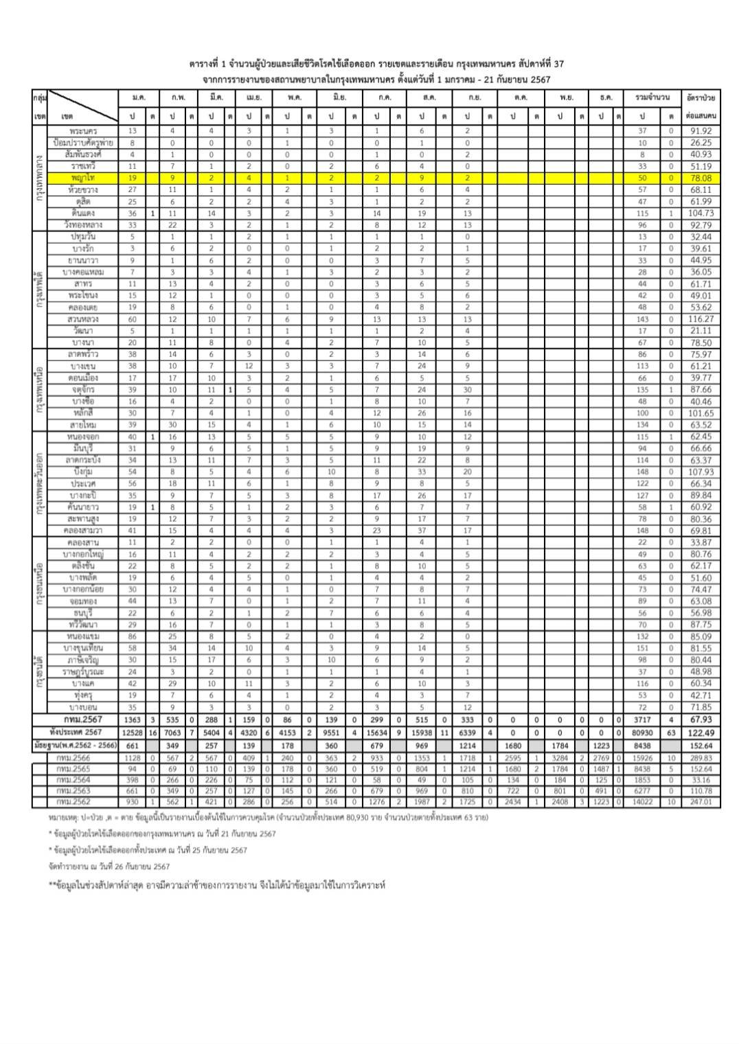30-09-20240.00ข้อมูลจากสำนักอนามัย ณ วันที่ 21 กันยายน 2567 ข้อมูลผู้ป่วยไข้เลือดออกในพื้นที่เขตพญาไท จำนวน 50 คน อัตราป่วยคิดเป็น 78.08 ต่อแสนประชากร