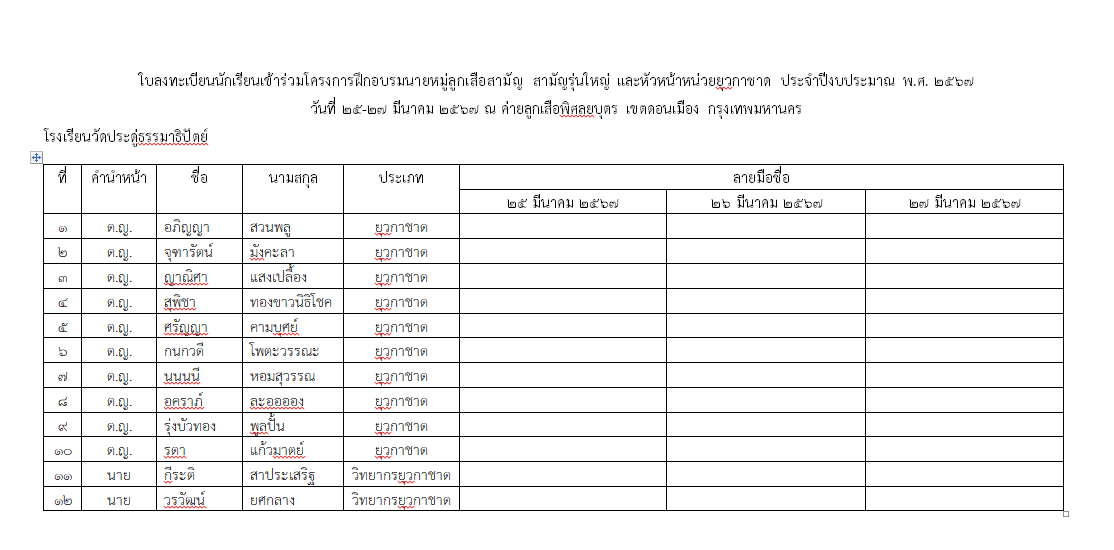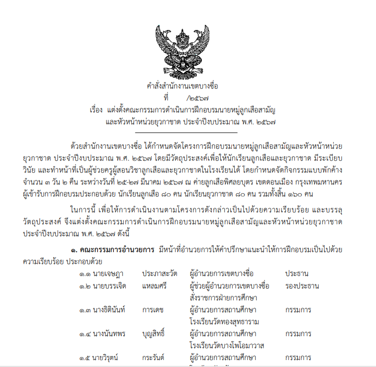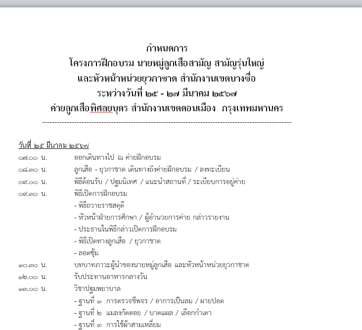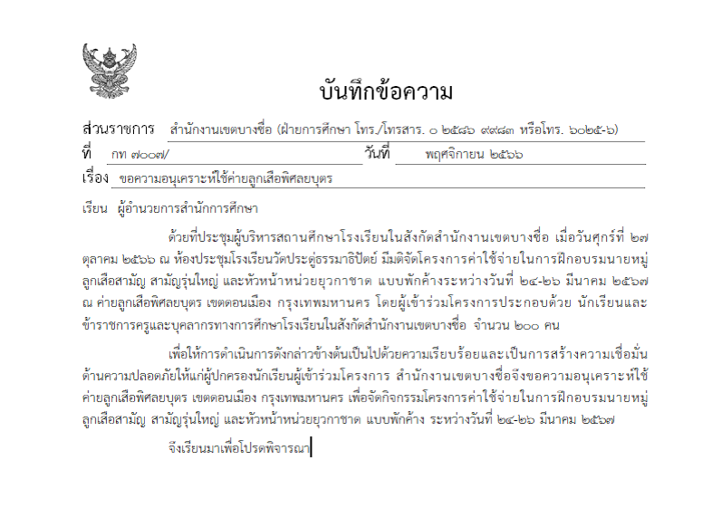 21-03-202410.00กำหนดจัดกิจกรรมแบบพักค้างให้กับนักเรียนลูกเสือ นักเรียนยุวกาชาด และครูวิทยากร ในวันที่ 25-27 มีนาคม 2566 ณ ค่ายลูกเสือพิศลยบุตร เขตดอนเมือง กรุงเทพมหานคร