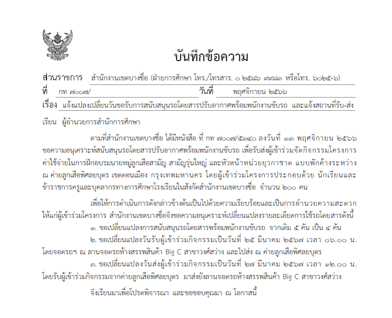 28-11-202310.00อยู่ระหว่างการประสานวิทยากร และรถรับส่งจากสำนักการศึกษา