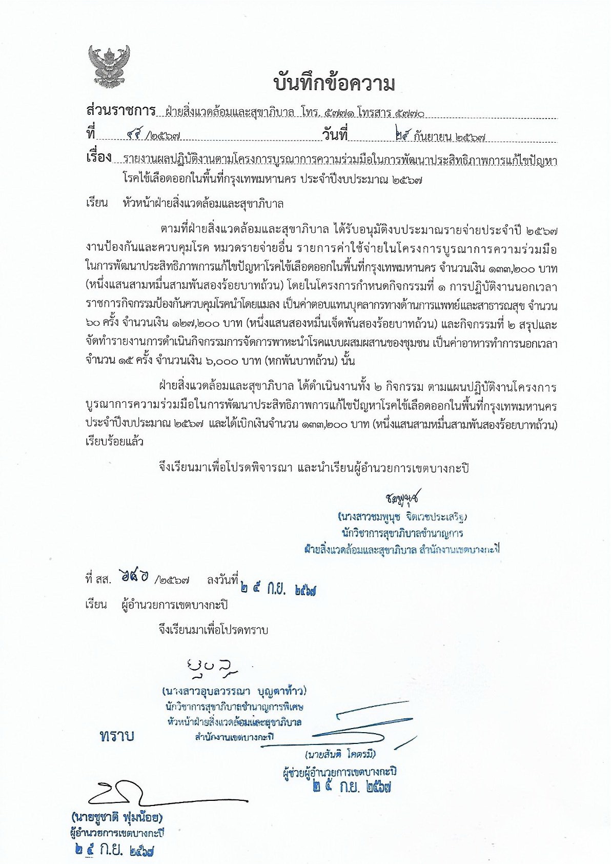 -โครงการบูรณาการความร่วมมือในการพัฒนาประสิทธิภาพการแก้ไขปัญหาโรคไข้เลือดออกในพื้นที่กรุงเทพมหานคร133,200.00100.00สำนักงานเขตบางกะปิฝ่ายสิ่งแวดล้อมและสุขาภิบาล
