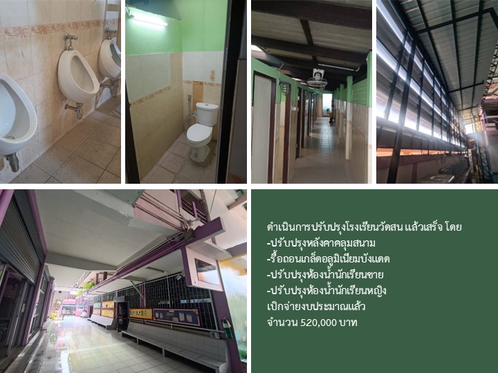 24-06-20241.00ดำเนินการปรับปรุงโรงเรียนวัดสน แล้วเสร็จ ตามสัญญาจ้าง เลขที่ ขรณ.17/2567 เบิกจ่ายงบประมาณแล้ว จำนวน 520,000 บาท (ร้อยละ 100 ตามสัญญาจ้าง) โดย - ปรับปรุงหลังคาคลุมสนาม - รื้อถอนเกล็ดอลูมิเนียมบังแดด - ปรับปรุงห้องน้ำนักเรียนชาย - ปรับปรุงห้องน้ำนักเรียนหญิง