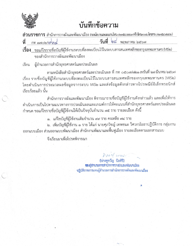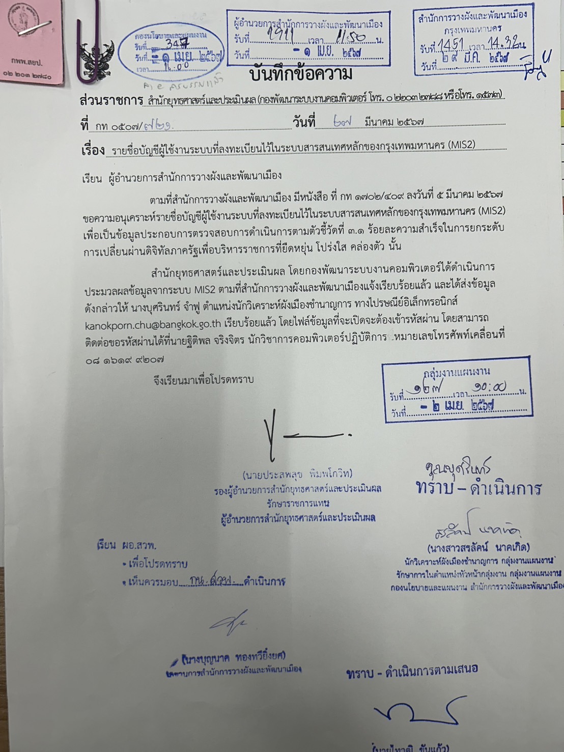 ![]() | 23-07-2024 | 2.00 | ดำเนินการใช้งานระบบสำหรับการปฏิบัติหน้าที่โดยวิธีการทางอิเล็กทรอนิกส์ฯ ได้แก่ 1. ระบบรับเรื่องร้องทุกข์ของกรุงเทพมหานคร 2.ไปรษณีย์อิเล็กทรอนิกส์ (อีเมล) saraban@bangkok.go.th และไปรษณีย์อิเล็กทรอนิกส์ของหน่วยงานและหรือส่วนราชการ ชื่อโดเมน @bangkok.go.th ที่กรุงเทพมหานครจัดสรรให้ 3.ประชุมผ่านสื่ออิเล็กทรอนิกส์ (ดำเนินการแล้วเสร็จ14ครั้ง) 4.ระบบสารบรรณอิเล็กทรอนิกส์ของกรุงเทพมหานคร 5.MIS2 จำนวนผู้ใช้งาน 75 User ตามหนังสือขอแก้ไขชื่อบัญชีผู้ใช้งานของสำนักการวางผังและพัฒนาเมือง ที่ กท 1702/188 ลงวันที่ 27 พ.ค.2567 6.ระบบยืนยันตัวตนและตรวจสอบตัวบุคคลในระบบดิจิทัล (CA) จำนวน 29 User , ระบบบริหารจัดการ (BMA Single Sign-On) อยู่ระหว่างการรวบรวมรายชื่อผู้ใช้งาน จำนวน 204 User 7.ระบบการลาอิเล็กทรอนิกส์ (E-Leave) จำนวน 199 User | ||