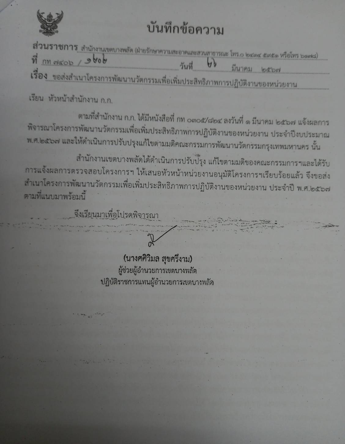![]() | 25-03-2024 | 5.00 | 1. ปรับแก้ไขโครงการพัฒนานวัตกรรมฯ ตามมติของคณะกรรมการพัฒนานวัตกรรมกรุงเทพมหานคร ตามหนังสือที่ กท 0305/428 ลงวันที่ 1 มีนาคม 2567 และส่งให้สำนักงาน ก.ก. ทางไปรษณีย์อิเล็กทรอนิกส์ เรียบร้อยแล้ว 2. อยู่ระหว่างทำหนังสือส่งสำเนาโครงการพัฒนานวัตกรรมฯ ให้สำนักงาน ก.ก. | ||