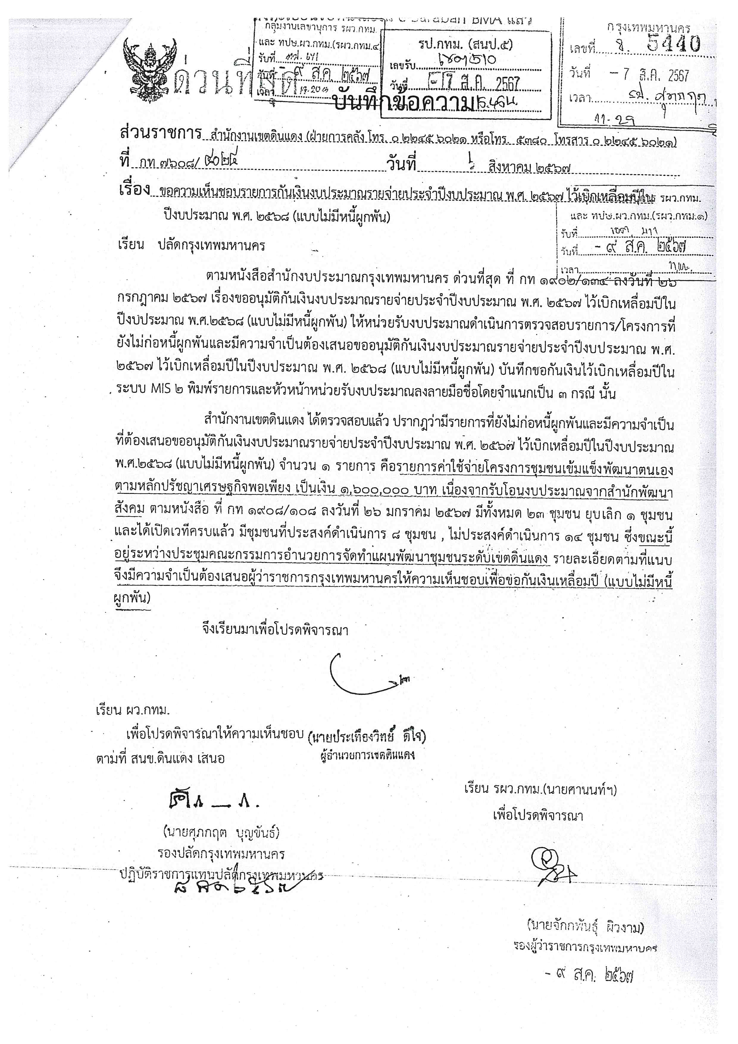 และได้ขอกันเงินงบประมาณไว้เบิกจ่ายเหลื่อมปีในปีงบประมาณ พ.ศ. 2568 (แบบไม่มีหนี้ผูกพัน) ตามหนังสือสำนักงานเขตดินแดง ด่วนที่สุด ที่ กท 7608/4024 ลว 6 ส.ค. 2567