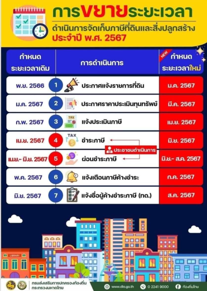![]() | 28-02-2024 | 0.00 | ขยายระยะเวลาเเจ้งการประเมินภาษี จากเดือนกุมภาพันธ์ เป็น เดือนเมษายน 2567 | ||