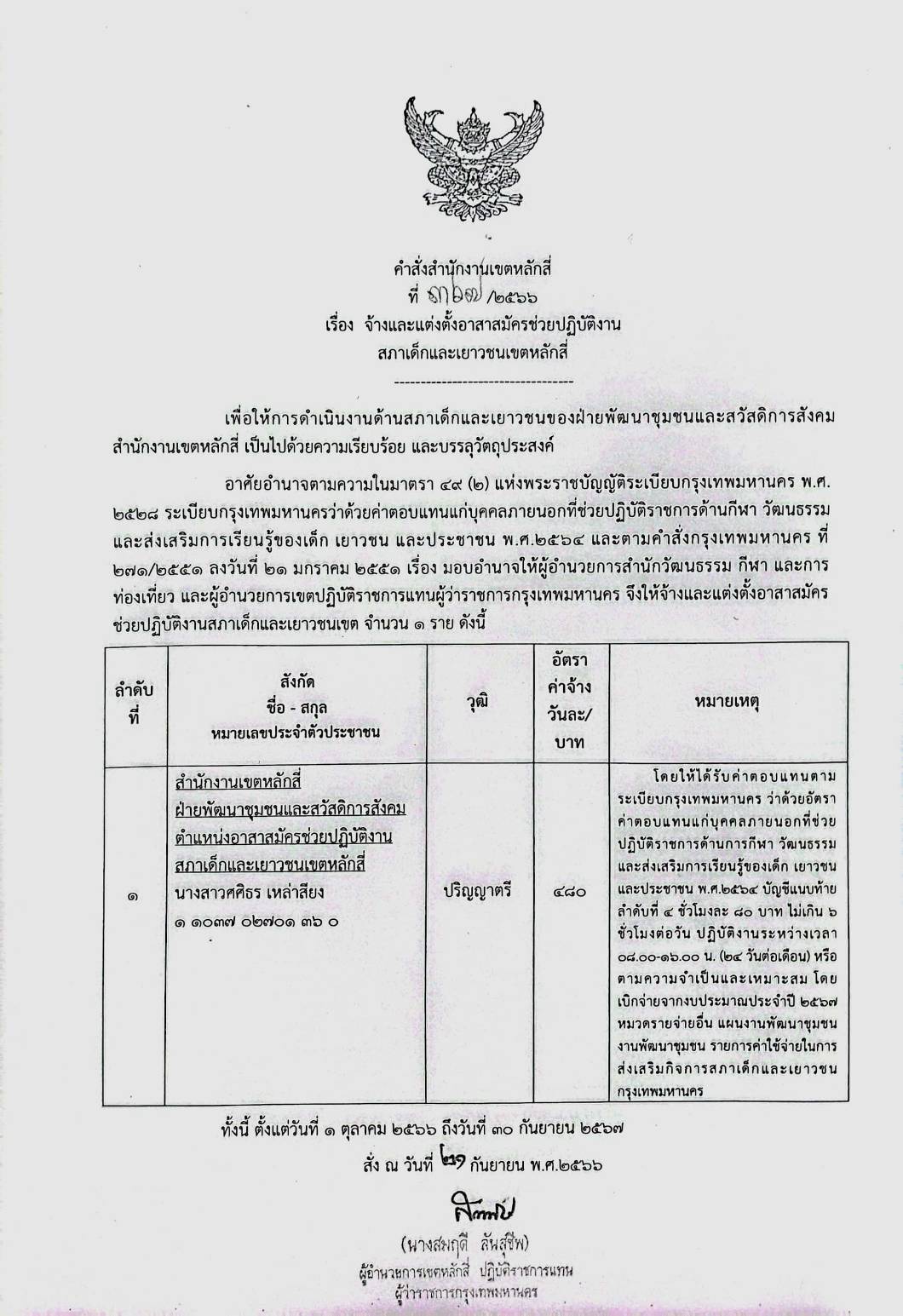 21-12-202321.00จ้างและแต่งตั้งอาสาสมัครช่วยปฏิบัติงานสภาเด็กและเยาวชนเขตหลักสี่ ตามคำสั่งสำนักงานเขตหลักสี่ ที่ 367/2566 ตั้งแต่วันที่ 1 ตุลาคม 2566 ถึง 30 กัยยายน 2567