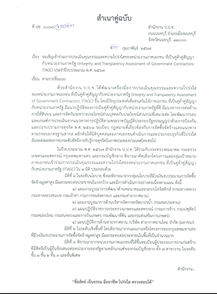 24-07-2024 0.00 สำนักงาน ก.ก. ได้มีหนังสือ ที่ กท 0307/4728 ลงวันที่ 28 มิถุนายน 2567 ถึงสำนักการโยธา สำนักการระบายน้ำ สำนักสิ่งแวดล้อม และสำนักการจราจรและขนส่ง ขอแจ้งการดำเนินการตามกระบวนการประเมินคุณธรรมและความโปร่งใสในการดำเนินงานของหน่วยงานภาคเอกชนที่เป็นคู่ค้าคู่สัญญากับหน่วยงานภาครัฐ (Integrity and Transparency Assessment of Government Contractors: ITAGC) ประจำปีงบประมาณ พ.ศ. 2567 เพื่อให้มอบหมายเจ้าหน้าที่ผู้รับผิดชอบดำเนินการตอบแบบวัดการรับรู้ของผู้มีส่วนได้ส่วนเสียภายนอก สำหรับภาครัฐที่เป็นคู่ค้าคู่สัญญา (ITAGC – E1) ของหน่วยงานภาคเอกชนที่เป็นคู่ค้าคู่สัญญากับหน่วยงานดังกล่าว ตามโครงการจัดซื้อจัดจ้าง ในระบบ ITAGC System ระหว่างวันที่ 1 เมษายน – 31 กรกฎาคม 2567 ตามที่ได้รับการประสานจากสำนักงาน ป.ป.ช. ตามหนังสือสำนักงาน ป.ป.ช. ที่ ปช 0009/ว 0048 ลงวันที่ 10 มิถุนายน 2567 และอยู่ระหว่างการประเมินคุณธรรมและความโปร่งใสในการดำเนินงานของหน่วยงานภาคเอกชนที่เป็นคู่ค้าคู่สัญญากับหน่วยงานภาครัฐ (Integrity and Transparency Assessment of Government Contractors: ITAGC) ประจำปีงบประมาณ พ.ศ. 2567 สิ้นสุดการประเมินวันที่ 31 กรกฎาคม 2567 ตามหนังสือสำนักงาน ป.ป.ช. ที่ ปช 0009/ว 0048 ลงวันที่ 10 มิถุนายน 2567