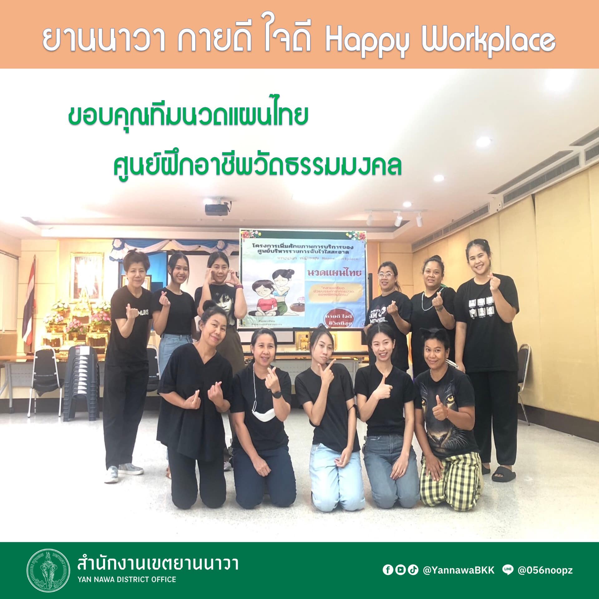 | 24-06-2024 | 0.00 |  | กิจกรรมนวดแผนไทย ในวันพฤหัสบดีที่ 30 พฤษภาคม 2567 เวลา 9.00-15.00 น. ณ ห้องอเนกประสงค์ ชั้น 1 สำนักงานเขตยานนาวา สำหรับข้าราชการและบุคลากรของสำนักงานเขตยานนาวาหรือประชาชนผู้รับบริการร่วมสร้างสุขในองค์กร Happy Workplace | |