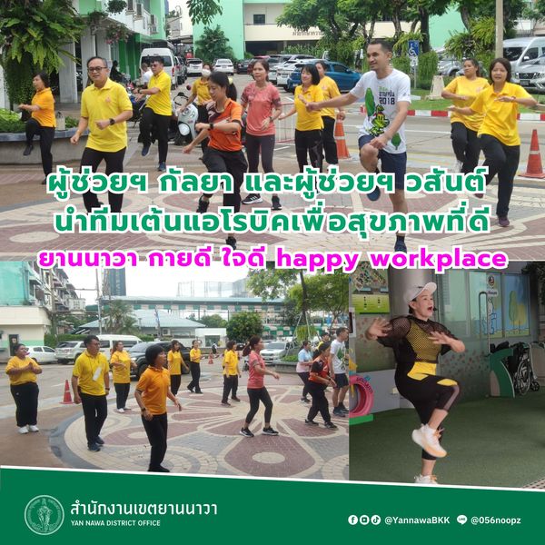 5 สิงหาคม 2567 ผอ.นางฯ (น.ส.วรุณลักษม์ พลหาญ) นำข้าราชการและบุคคลากรของสำนักงานเขตยานนาวา ร่วมออกกำลังกายด้วยการเต้นแอโรบิค ตามโครงการกายดี ใจดี happy workplace เพื่อส่งเสริมให้ข้าราชการ และบุคลากรสำนักงานเขตยานนาวามีสุขภาพแข็งแรง ซึ่งจัดกิจกรรมโดยกลุ่มร่วมใจพัฒนายานนาวา ได้รับสนับสนุนงบประมาณจากกองทุนหลักประกันสุขภาพเขตยานนาวา