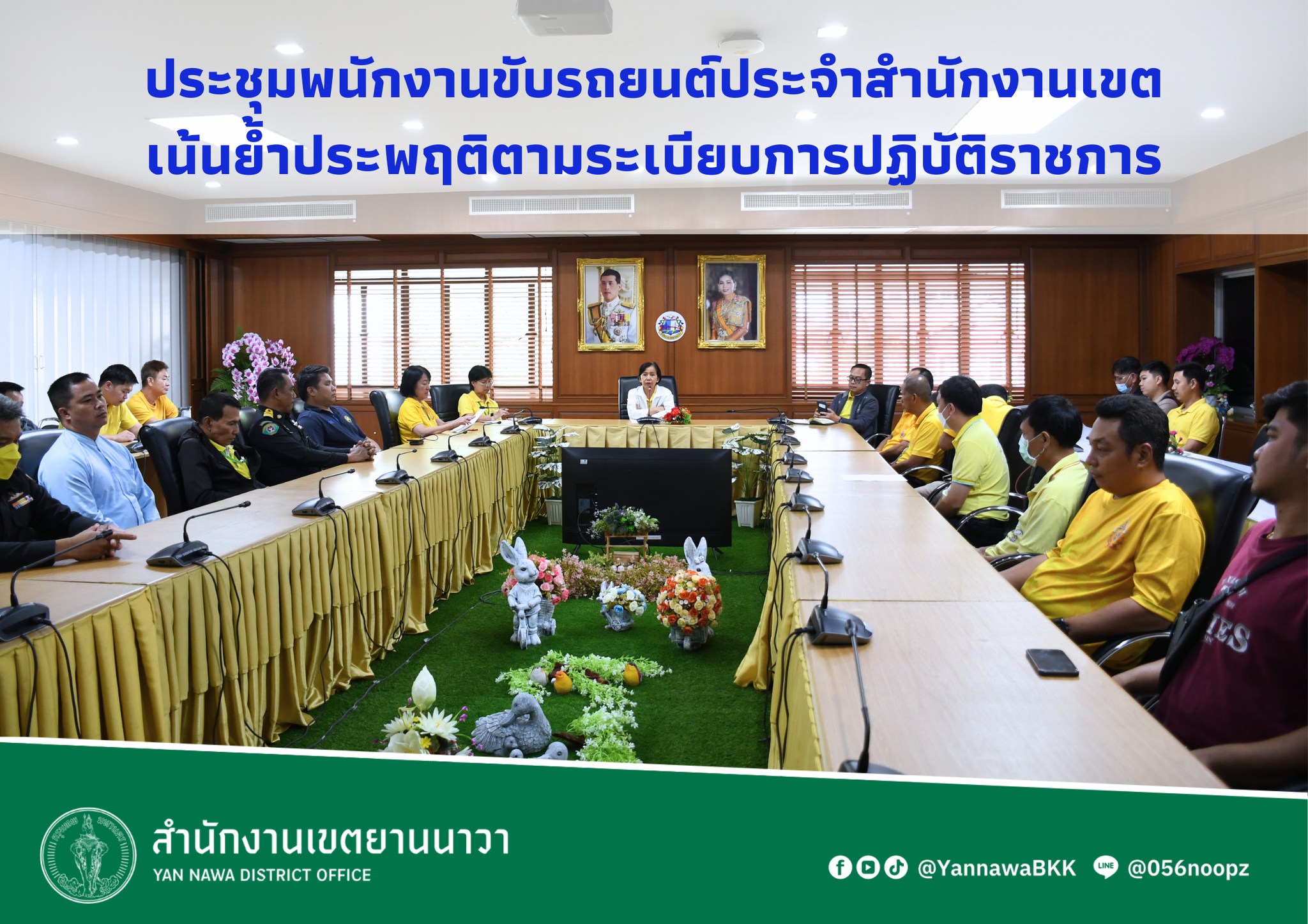 | 07-08-2024 | 0.00 |  | (5 ส.ค. 67) ผอ.วรุณลักษม์ พลหาญ ผู้อำนวยการเขตยานนาวา เป็นประธานการประชุม เพื่อมอบนโยบายการปฏิบัติงานให้กับพนักงานขับรถยนต์ส่วนกลางของสำนักงานเขต เน้นย้ำให้พนักงานขับรถยนต์คำนึงถึงความปลอดภัยและระมัดระวัง ป้องกันความเสี่ยงในการใช้รถราชการ โดยเคารพกฎจราจร ปฏิบัติตามกฎจราจรโดยเคร่งครัด การแต่งกายให้เหมาะสมถูกต้องตามระเบียบ การดูแลรักษาสภาพรถยนต์ น้ำมันเชื้อเพลิงให้พร้อมใช้งานสนับสนุนภารกิจกรณีมีเหตุเร่งด่วน หมั่นตรวจสภาพเครื่องยนต์ตามระยะทางหรือระยะเวลาที่กำหนด โดยให้รายงานสภาพรถยนต์ทุกวันจันทร์ พร้อมทั้งทำเอกสารรายงานผู้บังคับบัญชาทุกเดือน กำชับพนักงานขับรถยนต์ให้ดับเครื่องยนต์ทุกครั้งเมื่อไม่ปฏิบัติงานหรือจอดรถรอรับ – ส่ง และไม่เบียดเบียนเวลาราชการ ปฏิบัติงานให้เต็มเวลา ไม่ใช้เวลาราชการในการประกอบอาชีพส่วนตัว ไม่เสพสุราหรือสิ่งมึนเมาขณะปฏิบัติหน้าที่ ไม่ยุ่งเกี่ยวกับอบายมุข ให้รักษาภาพลักษณ์ขององค์กร ปฏิบัติงานด้วยความซื่อสัตย์สุจริต โดยประธานในที่ประชุมและคณะผู้บริหาร ได้มอบกำลังใจให้กับพนักงานขับรถยนต์ส่วนกลาง ขอให้มีความตั้งใจในการทำงานตามที่ได้รับมอบหมาย พร้อมทั้งได้ให้ความรู้ แจ้งสิทธิประโยชน์และสวัสดิการที่เกี่ยวข้อง | |