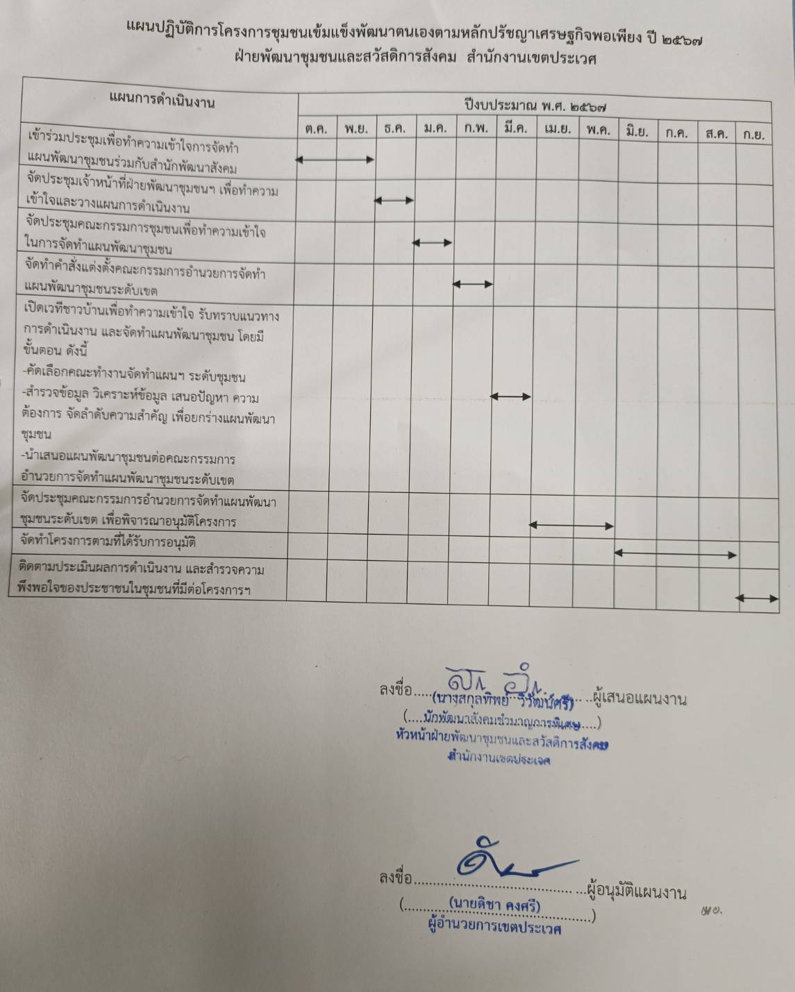 1 | มีแผนปฏิบัติการในการดำเนินการโครงการชุมชนเข้มแข็งพัฒนาตนเองฯในป2567 ของสำนักงานเขตประเวศ พร้อมเสนอต่อผู้บริหารกรุงเทพมหานครให้ความเห็นชอบ | 20.00 | 01-10-2023 | 31-12-2023 |