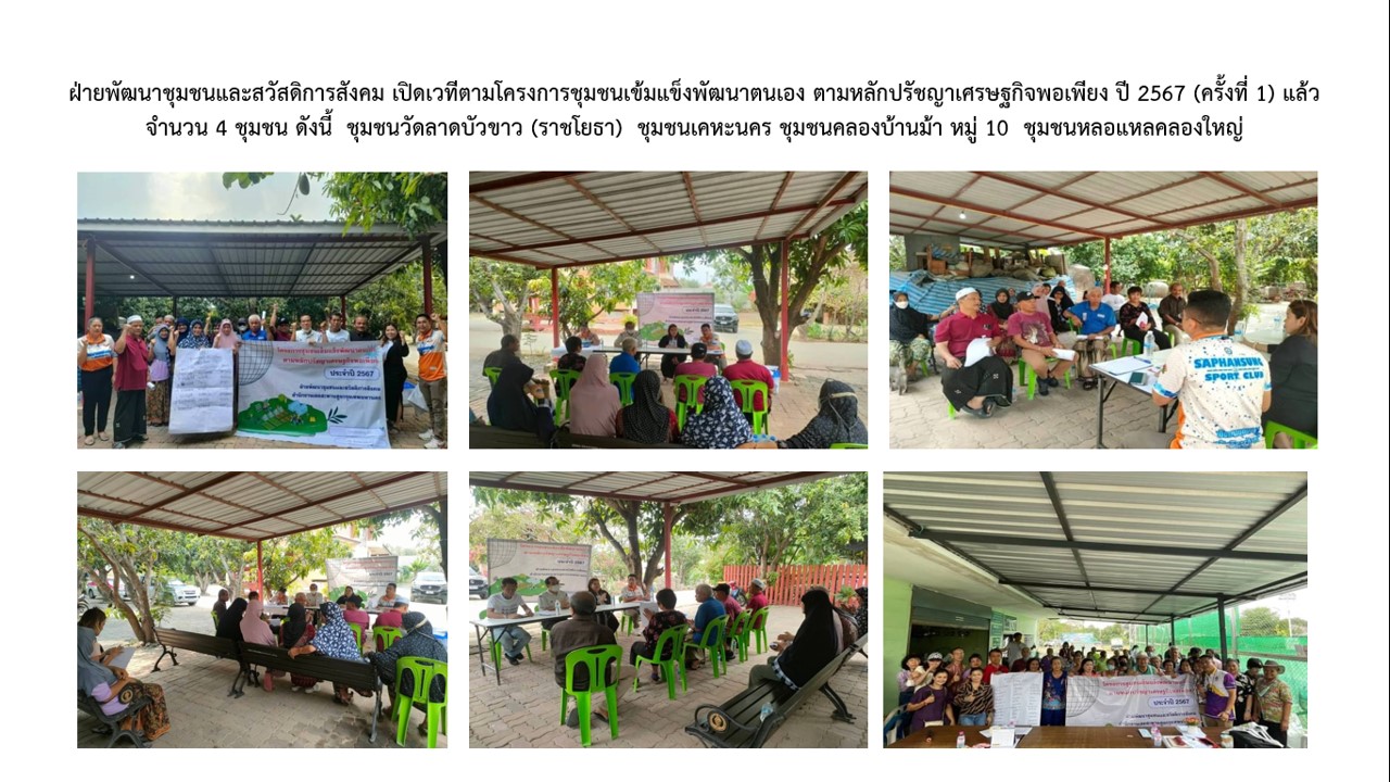 05-03-20240.00ฝ่ายพัฒนาชุมชนและสวัสดิการสังคม เปิดเวทีตามโครงการชุมชนเข้มแข็งพัฒนาตนเอง ตามหลักปรัชญาเศรษฐกิจพอเพียง ปี 2567 (ครั้งที่ 1) แล้ว จำนวน 4 ชุมชน ดังนี้ 1. ชุมชนวัดลาดบัวขาว (ราชโยธา) 2. ชุมชนเคหะนคร 3. ชุมชนคลองบ้านม้า หมู่ 10 4. ชุมชนหลอแหลคลองใหญ่