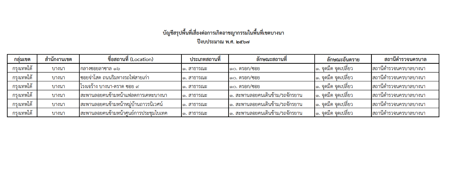![]() | - | แก้ไขจุดเสี่ยงต่อการเกิดอาชญากรรม (สายตรวจตู้เขียว) | 0.00 | 100.00 | สำนักงานเขตบางนา | ฝ่ายเทศกิจ |
