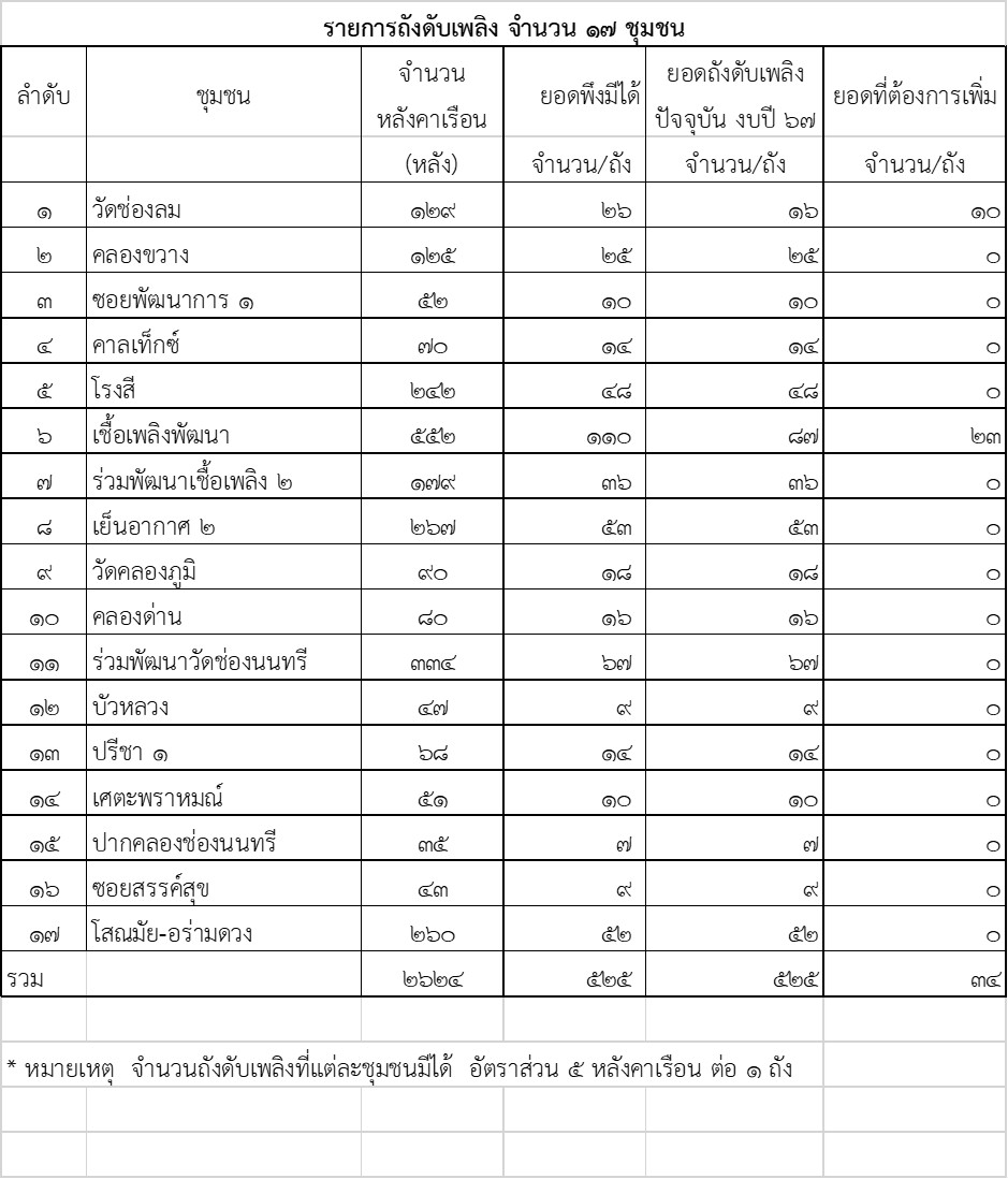 | 10-02-2024 | 0.00 |  | รายงานยอดถังดับเพลิงในชุมชนพื้นที่เขตยานนาวา จำนวน 17 ชุมชน รวมจำนวนทั้งสิ้น 525 ถัง | |