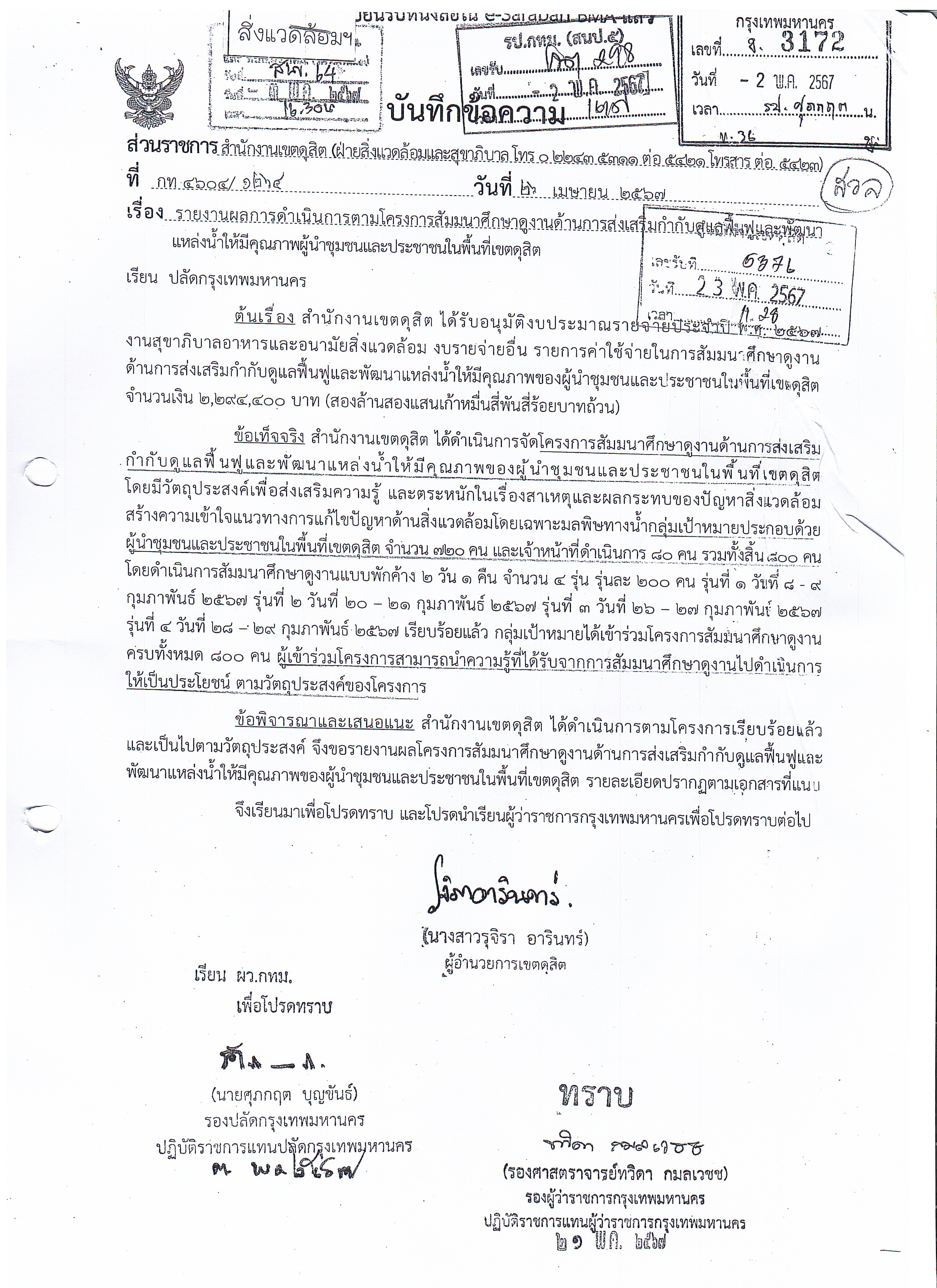 23-08-20245.00ประเมินผลโครงการ และสรุปรายงานผลให้ผู้บริหาร มีหนังสือรายงานผู้บังคับบัญชาทราบผลการดำเนินการแล้ว ตามหนังสือสำนักงานเขตดุสิต ที่ กท 4604/1264 ลงวันที่ 26 เมษายน 2567