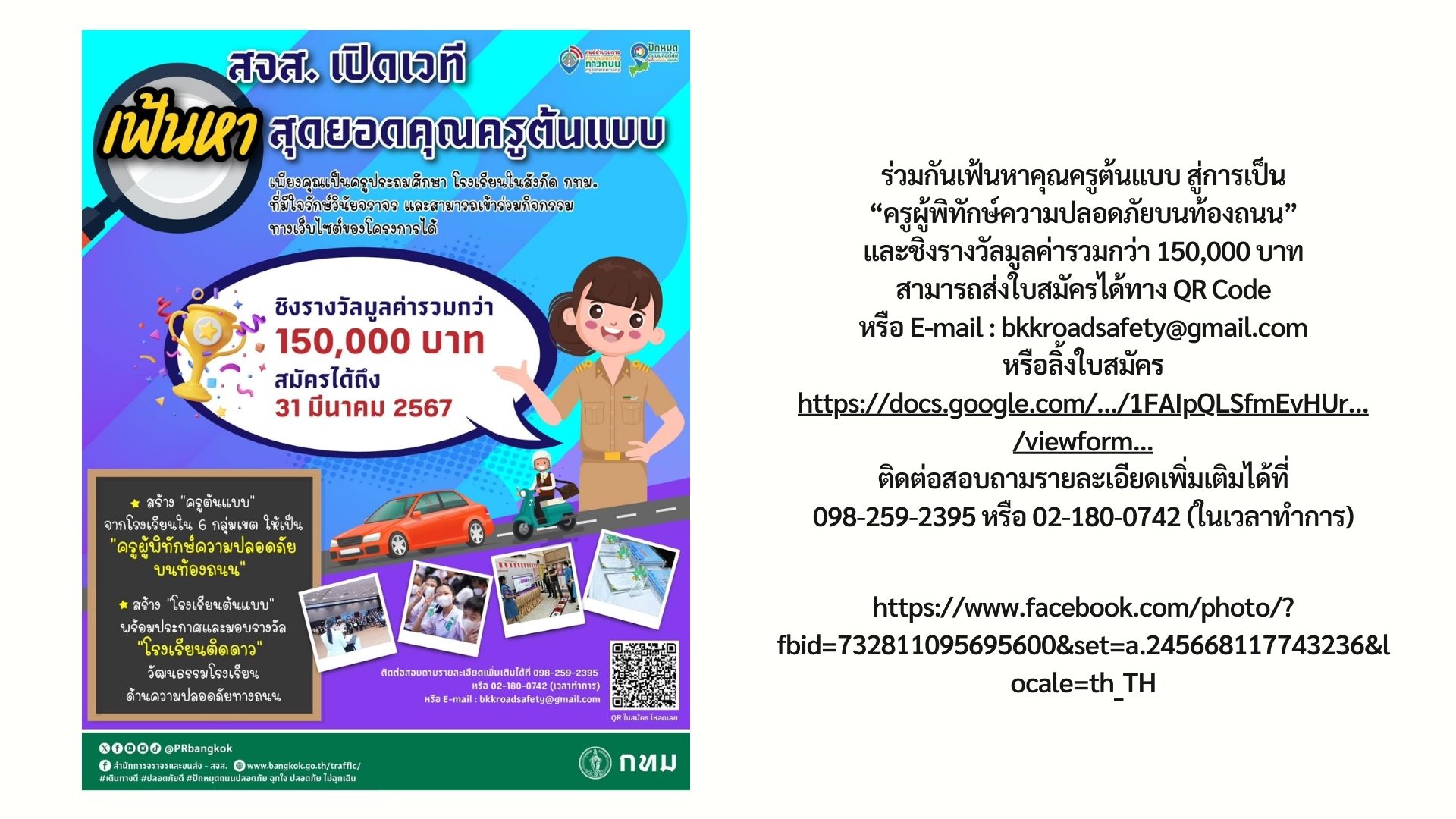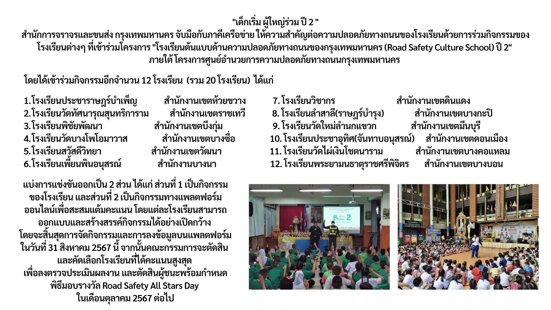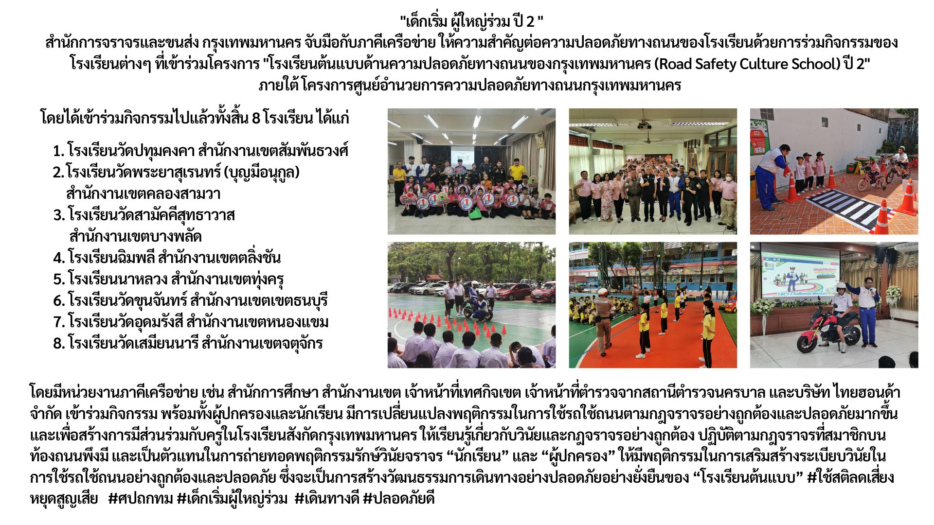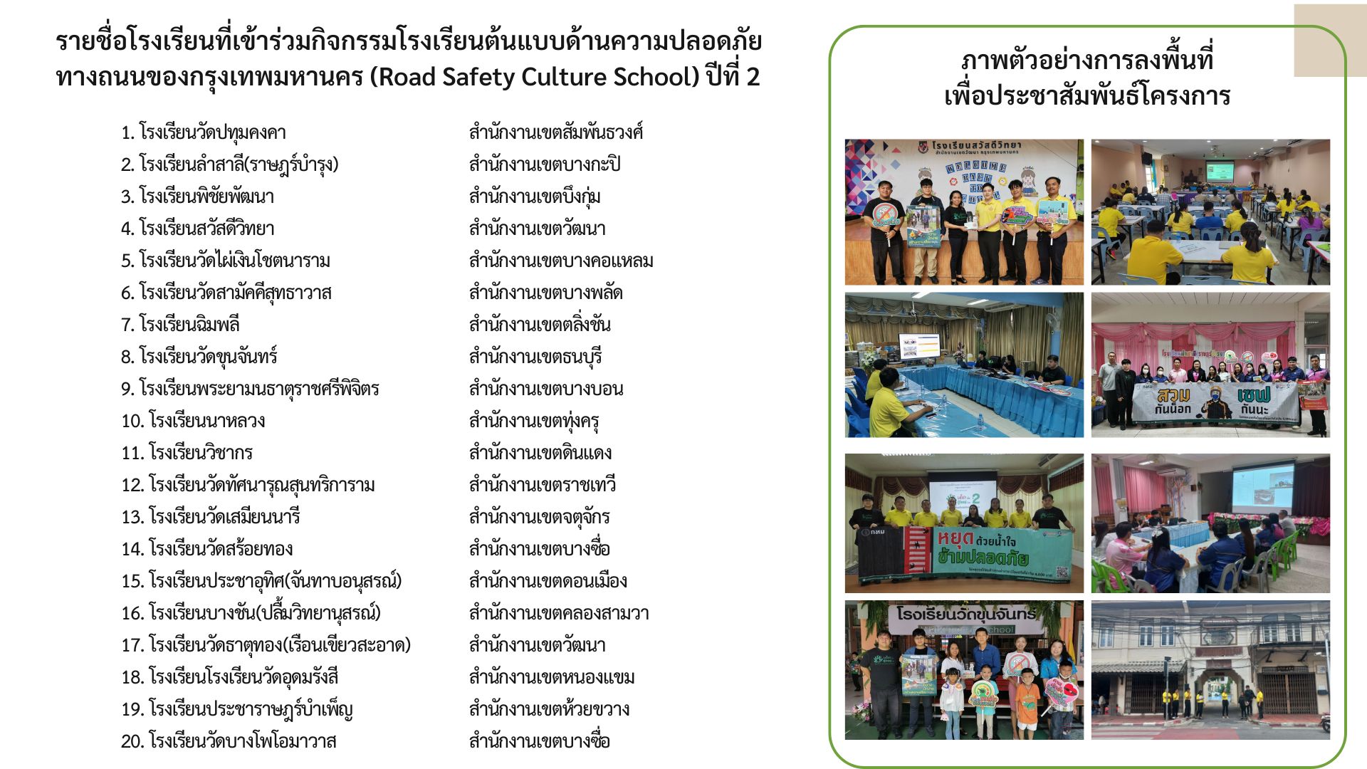 ![]() | - | OKR 1.2.10 จำนวนโรงเรียนเข้าร่วมกิจกรรมโรงเรียนต้นแบบด้านความปลอดภัยทางถนนกรุงเทพมหานคร (Road Safety Culture School) | แห่ง | 18.00 | 100.00 | 555.56 |