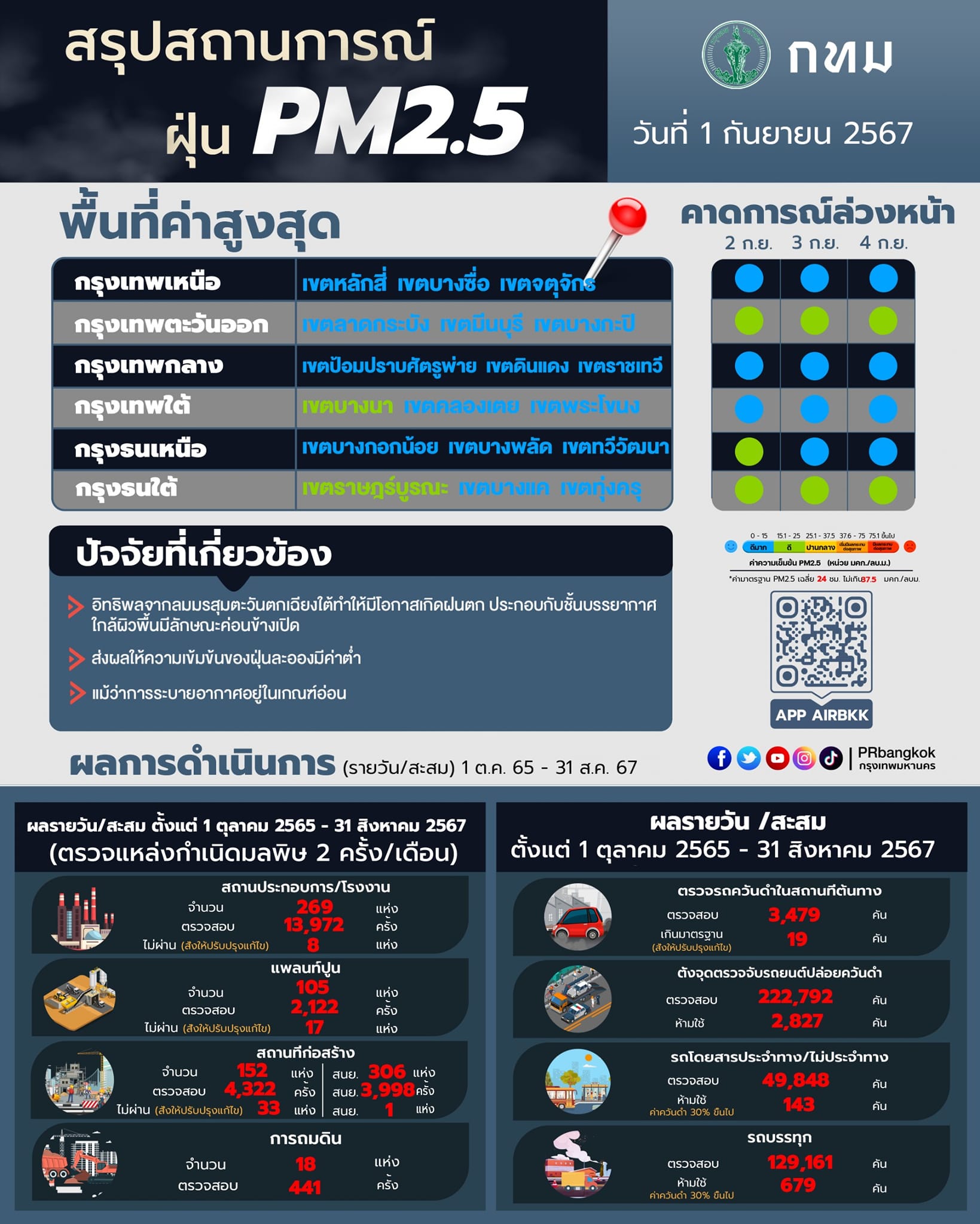 | 31-08-2024 | 0.00 |  | มีระบบเฝ้าระวังและตรวจวัดคุณภาพอากาศครอบคุลมพื้นที่กรุงเทพมหานครตลอด 24 ชั่วโมง ในรูปแบบศูนย์ข้อมูลคุณภาพอากาศกรุงเทพมหานคร โดยสามารถพยากรณ์คาดการณ์แจ้งเตือนสถานการณ์ฝุ่น PM2.5 ล่วงหน้า ได้ 3 วัน | |