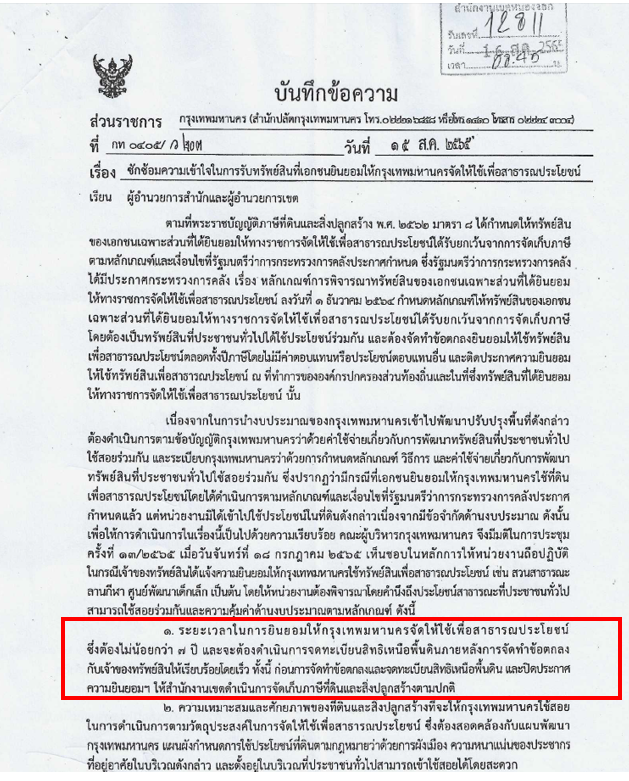 20-03-20240.00เนื่องจากระยะเวลาในการยินยอมให้กรุงเทพฯ จัดให้ใช้พื้นที่เพื่อสาธารณะประโยชน์ น้อยกว่า 7 ปี และเจ้าของพื้นที่ไม่ยินยอมต่อสัญญา เขตจึงไม่สามารถเข้าดำเนินการ หรือของบประมาณในการปรับปรุงได้