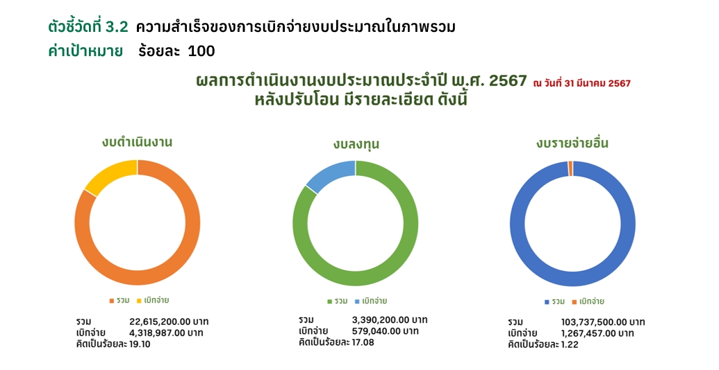 ![]() | 30-09-2024 | 41.50 | งบประมาณรายจ่ายประจำปีงบประมาณ พ.ศ. 2566 และงบประมาณรายจ่ายเพิ่มเติมประจำปีงบประมาณ พ.ศ. 2566 พ.ศ. 2566 กันไว้เบิกเหลื่อมปีในปีงบประมาณ พ.ศ. 2567 แบบไม่มีหนี้ผูกพัน (ไม่รวมงบบุคลากร) งบประมาณรายจ่ายประจำปี งบประมาณ พ.ศ. 2567 - งบดำเนินงาน งบประมาณหลังปรับโอน 19,190,881 บาท ผลการเบิกจ่าย 13,426,544.35 บาท คิดเป็นร้อยละ 69.96 - งบลงทุน งบประมาณหลังปรับโอน 4,469,190 บาท ผลการเบิกจ่าย 4,358,390 บาท คิดเป็นร้อยละ 97.52 - งบรายจ่ายอื่น งบประมาณหลังปรับโอน 96,376,964 บาท ผลการเบิกจ่าย 80,039,254 บาท คิดเป็นร้อยละ 83.05 รวมทั้งสิ้น 120,037,035 บาท ผลการเบิกจ่าย 97,824,188.35 บาท คิดเป็นร้อยละ 81.50 (ข้อมูล ณ วันที่ 15 กันยายน 2567) | ||