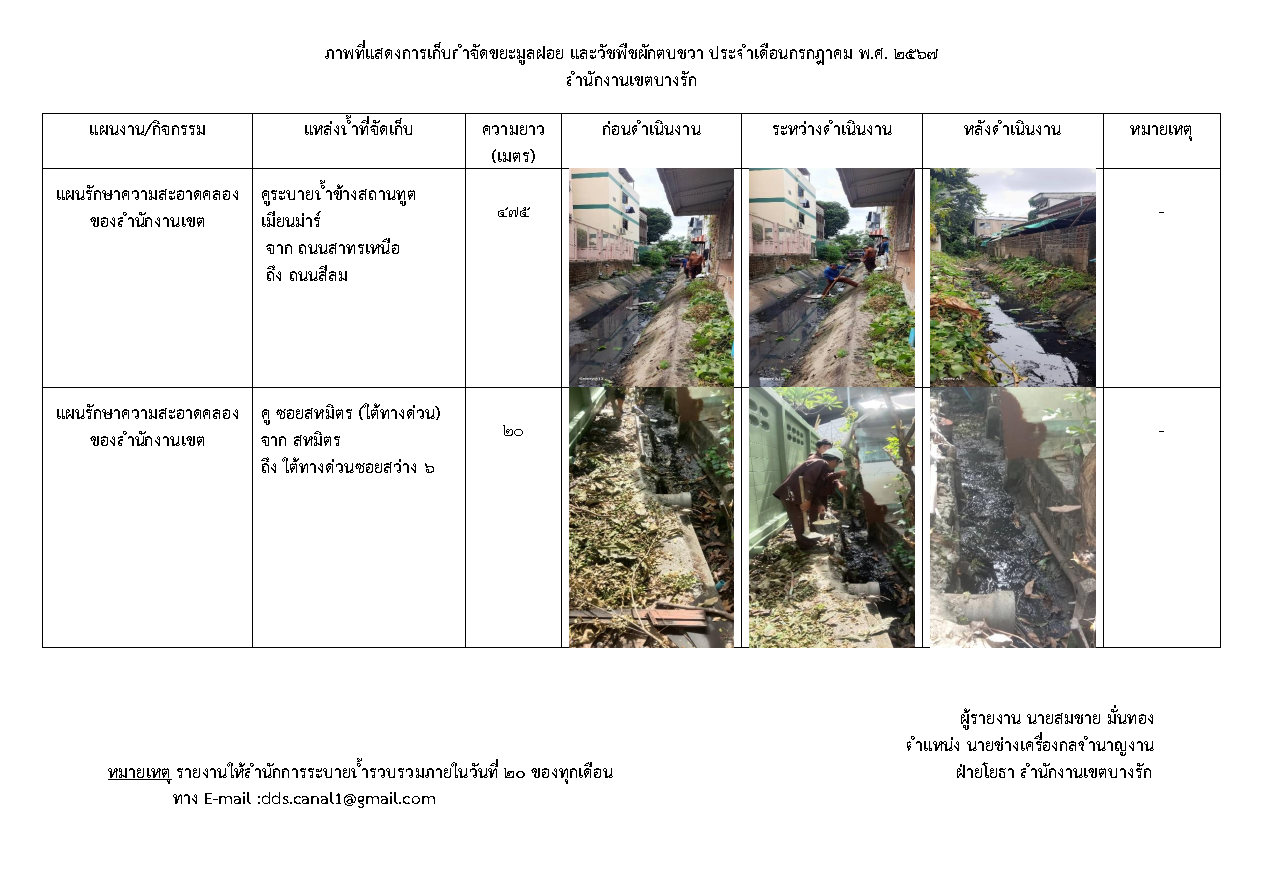 05-09-20241.00เดือนสิงหาคม 2567 ดำเนินการเปิดทางน้ำไหลคลองซ้ำในคลอง 1. คูระบายน้ำซอยพิพัฒน์ 2. คลองหัวลำโพงเก่า 3. ลำกระโดงซอยปราโมทย์ 2 4. คูซอยสุขสันต์