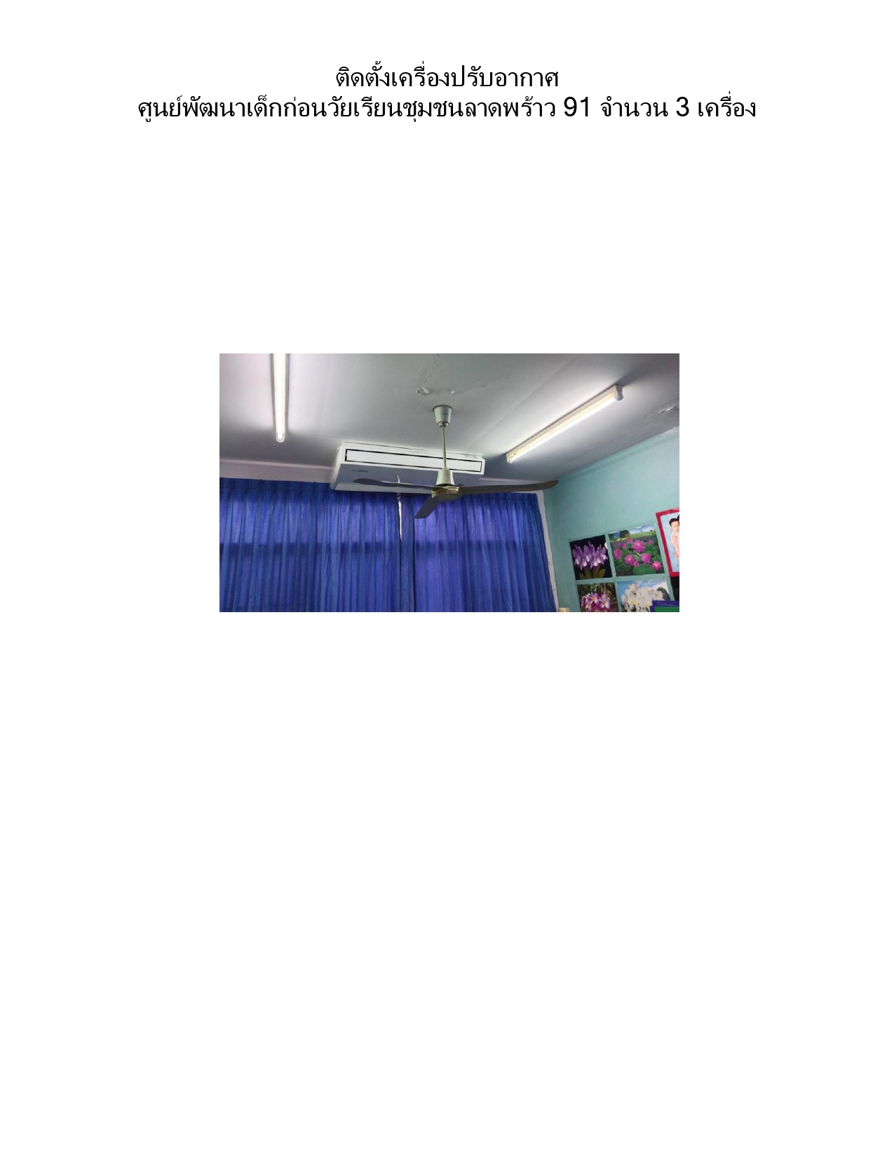 06-02-20241.00ดำเนินการปรับปรุงโดยการติดตั้งเครื่องปรับอากาศ ขนาด 30,000 BTU จำนวน 3 เครื่อง เป็นเงิน 141,600.-บาท ภายในศูนย์พัฒนาเด็กก่อนวัยเรียนชุมชนลาดพร้าว 91 เรียบร้อยแล้ว