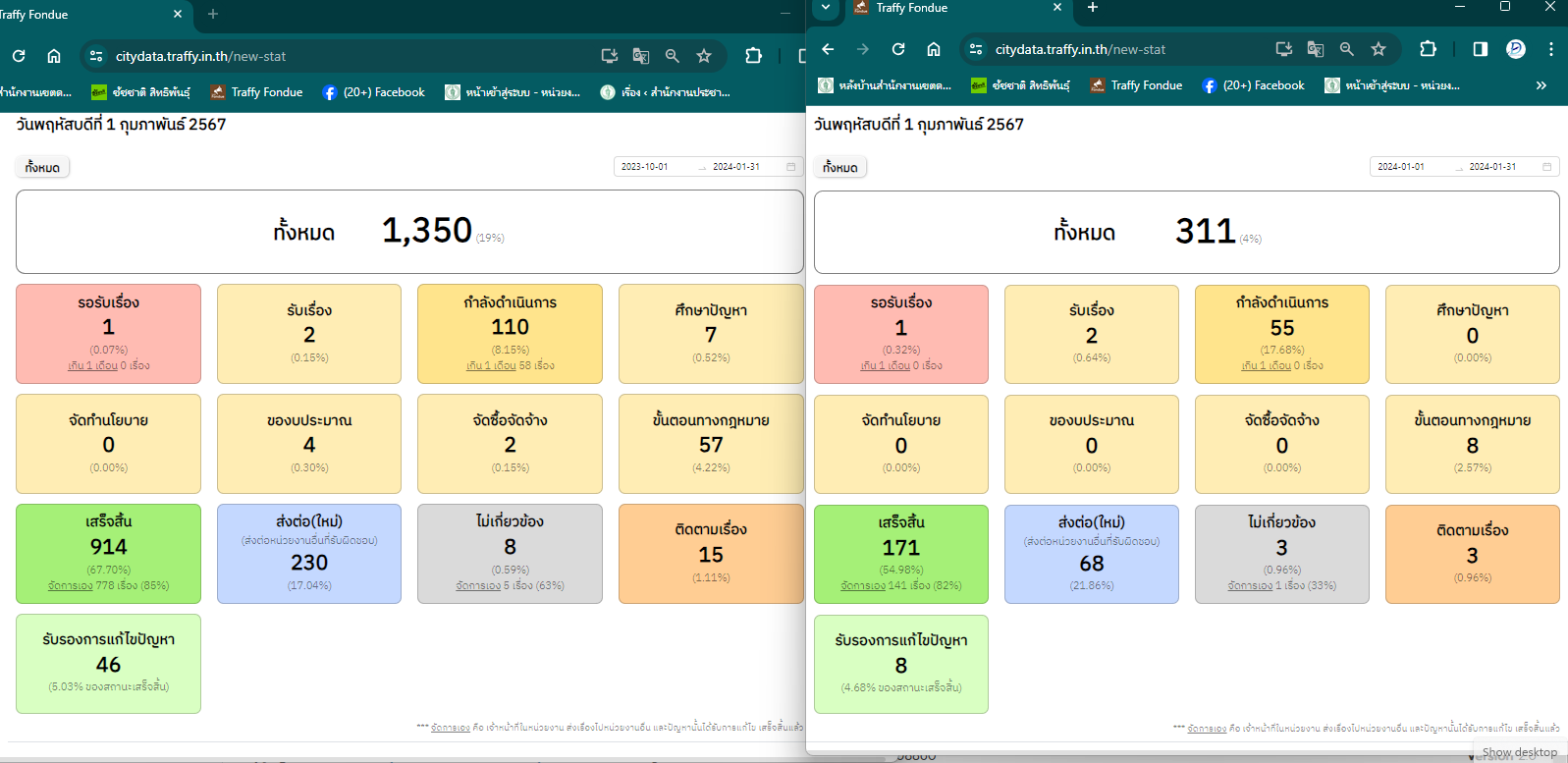 ![]() | 01-02-2024 | 54.98 | ![]() | วันที่ 1-31 ม.ค. 2567 เรื่องร้องเรียนทั้งหมด 311 เรื่อง เสร็จสิ้น 171 เรื่อง อยู่ระหว่างดำเนินการ 55 เรื่อง ส่งต่อ(ใหม่) 68 เรื่อง รอรับเรื่อง 1 เรื่อง สถานะอื่นๆ 11 เรื่อง ไม่เกี่ยวข้อง 3 เรื่อง | |