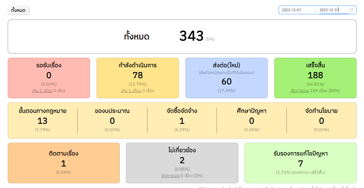 ![]() | 04-01-2024 | 54.81 | ![]() | วันที่ 1-31 ธ.ค. 2566 เรื่องร้องเรียนทั้งหมด 343 เรื่อง เสร็จสิ้น 188 เรื่อง อยู่ระหว่างดำเนินการ 78 เรื่อง ส่งต่อ(ใหม่) 60 เรื่อง รอรับเรื่อง 0 เรื่อง สถานะอื่นๆ 15 เรื่อง ไม่เกี่ยวข้อง 2 เรื่อง | |