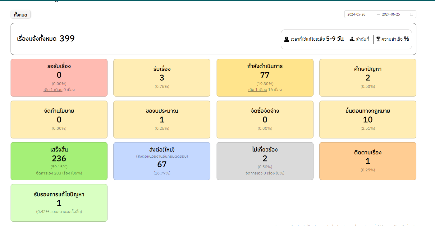 ![]() | 02-07-2024 | 59.15 | ![]() | วันที่ 26 พ.ค. – 25 มิ.ย. 2567 เรื่องร้องเรียนทั้งหมด 399 เรื่อง เสร็จสิ้น 236 เรื่อง อยู่ระหว่างดำเนินการ 77 เรื่อง ส่งต่อ(ใหม่) 67 เรื่อง รอรับเรื่อง 0 เรื่อง สถานะอื่นๆ 14 เรื่อง ไม่เกี่ยวข้อง 2 เรื่อง | |