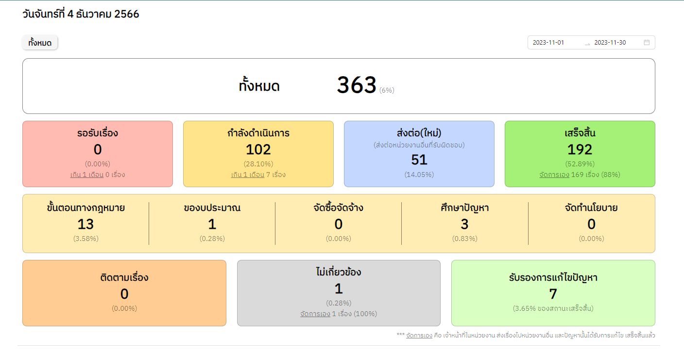 ![]() | 04-12-2023 | 63.52 | ![]() | วันที่ 1 ต.ค.- 30 พ.ย. 2566 เรื่องร้องเรียนทั้งหมด 696 เรื่อง เสร็จสิ้น 485 เรื่อง อยู่ระหว่างดำเนินการ 43 เรื่อง ส่งต่อ(ใหม่) 111 เรื่อง รอรับเรื่อง 0 เรื่อง สถานะอื่นๆ 47 เรื่อง ไม่เกี่ยวข้อง 3 เรื่อง | |