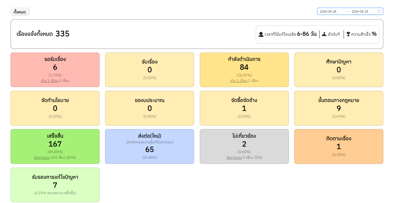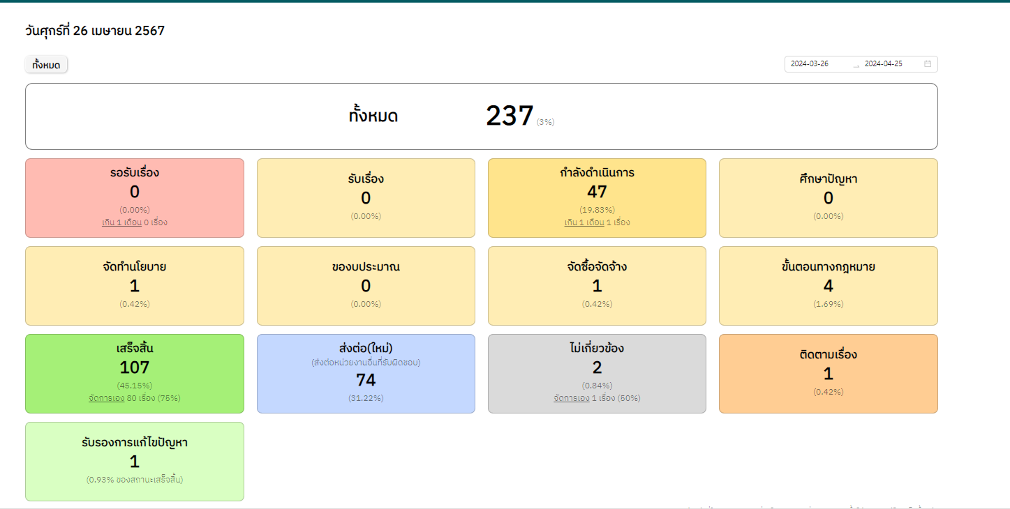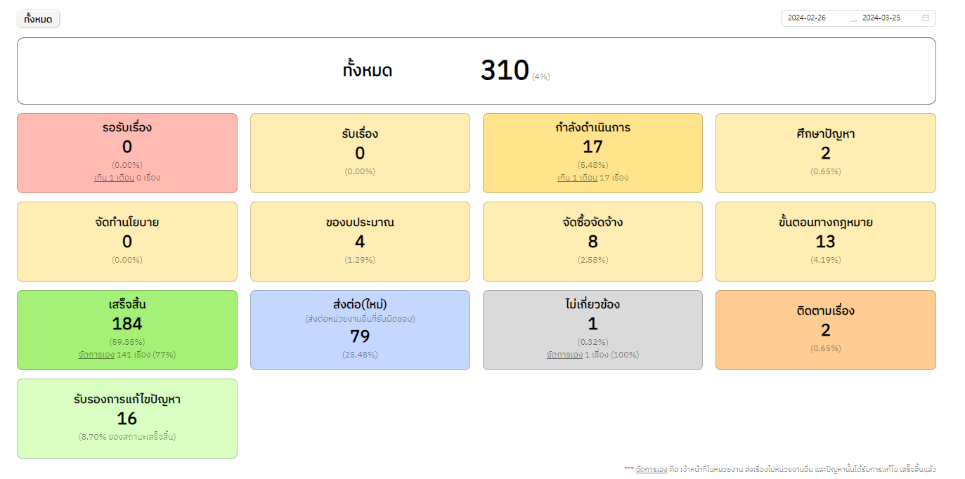 ![]() | 27-02-2024 | 45.15 | ![]() | วันที่ 1-25 ก.พ. 2567 เรื่องร้องเรียนทั้งหมด 278 เรื่อง เสร็จสิ้น 138 เรื่อง อยู่ระหว่างดำเนินการ 76 เรื่อง ส่งต่อ(ใหม่) 54 เรื่อง รอรับเรื่อง 1 เรื่อง สถานะอื่นๆ 9 เรื่อง ไม่เกี่ยวข้อง – เรื่อง | |