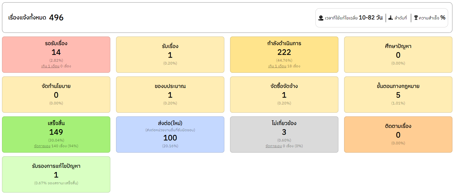 ![]() | 30-09-2024 | 30.04 | ![]() | วันที่ 26 ส.ค. - 30 ก.ย. 2567 เรื่องร้องเรียนทั้งหมด 496 เรื่อง เสร็จสิ้น 149 เรื่อง อยู่ระหว่างดำเนินการ 222 เรื่อง ส่งต่อ(ใหม่) 100 เรื่อง รอรับเรื่อง 14 เรื่อง ไม่เกี่ยวข้อง 3 เรื่อง | |