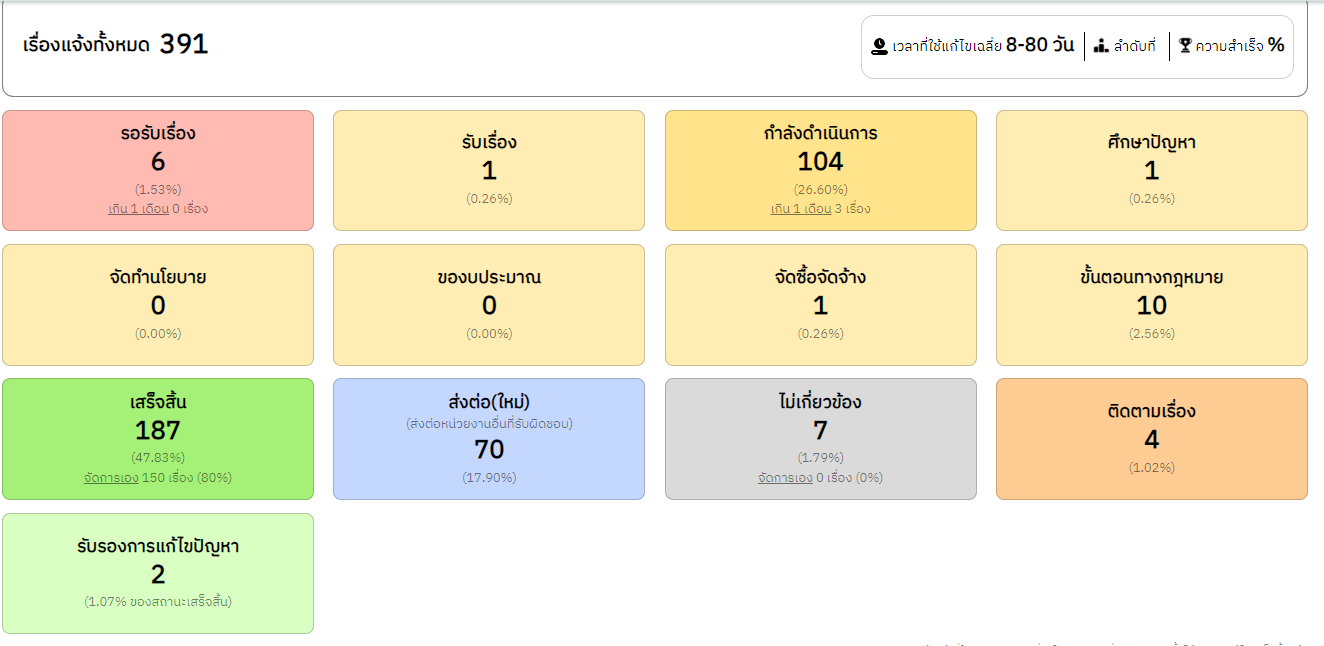 ![]() | 26-07-2024 | 47.83 | ![]() | วันที่ 26 มิ.ย.-25 ก.ค. 2567 เรื่องร้องเรียนทั้งหมด 391 เรื่อง เสร็จสิ้น 187 เรื่อง อยู่ระหว่างดำเนินการ 104 เรื่อง ส่งต่อ(ใหม่) 70 เรื่อง รอรับเรื่อง 6 เรื่อง สถานะอื่นๆ 16 เรื่อง ไม่เกี่ยวข้อง 7 เรื่อง | |