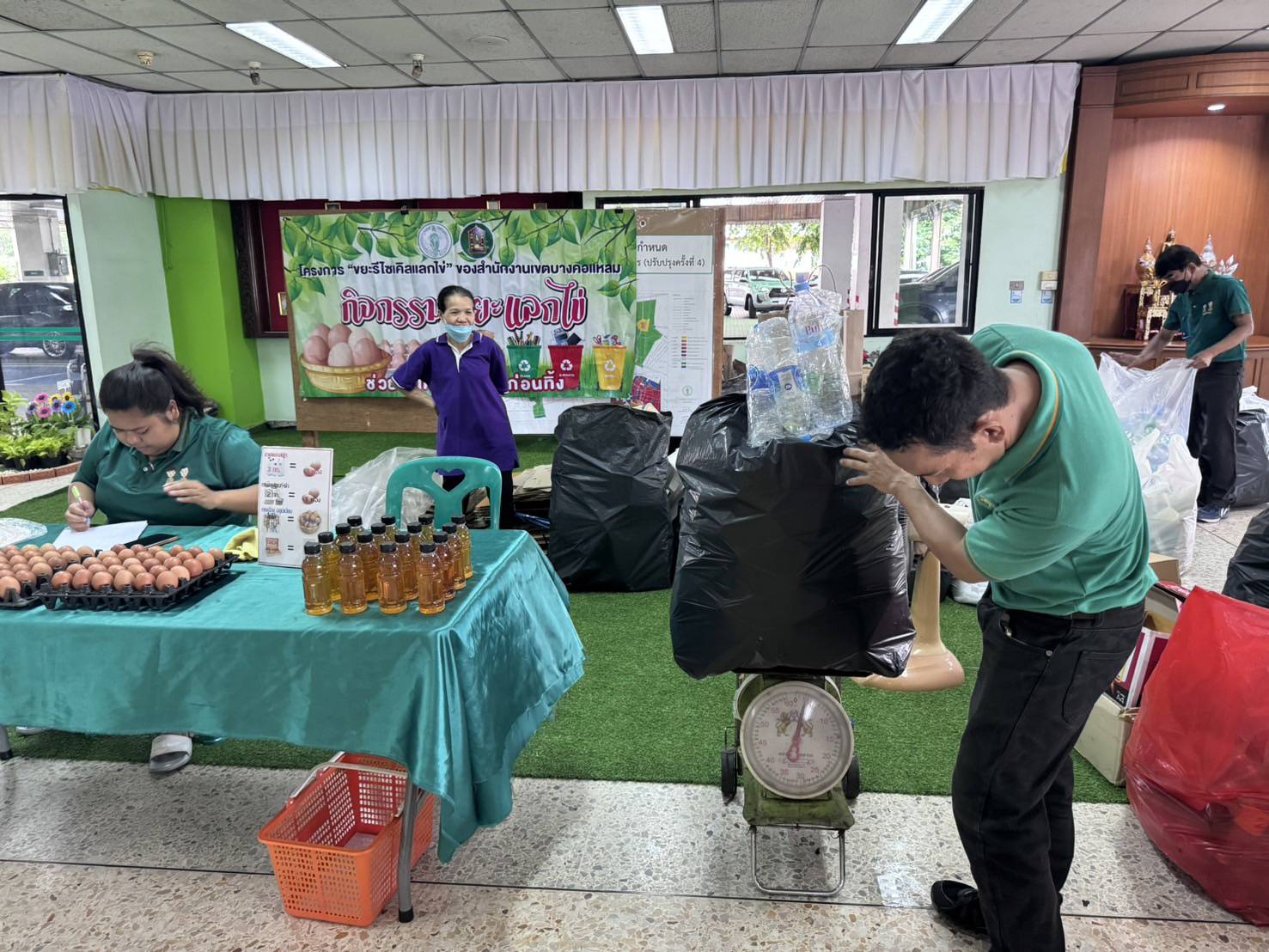 ![]() | 20-02-2024 | 6.00 | ![]() | ประชาสัมพันธ์และดำเนินงานโครงการฯ ประจำเดือนกุมภาพันธ์ 2567...มีผู้เข้าร่วมโครงการฯ 20 ราย มีขยะรีไซเคิลที่แลกไข่ จำนวน 95 กก. เป็นกระดาษขาว-ดำ 45 กก. ขวดพลาสติกใส 25 กก. ขวดแก้ว 15 กก. กระดาษลัง 10 กก.. | |