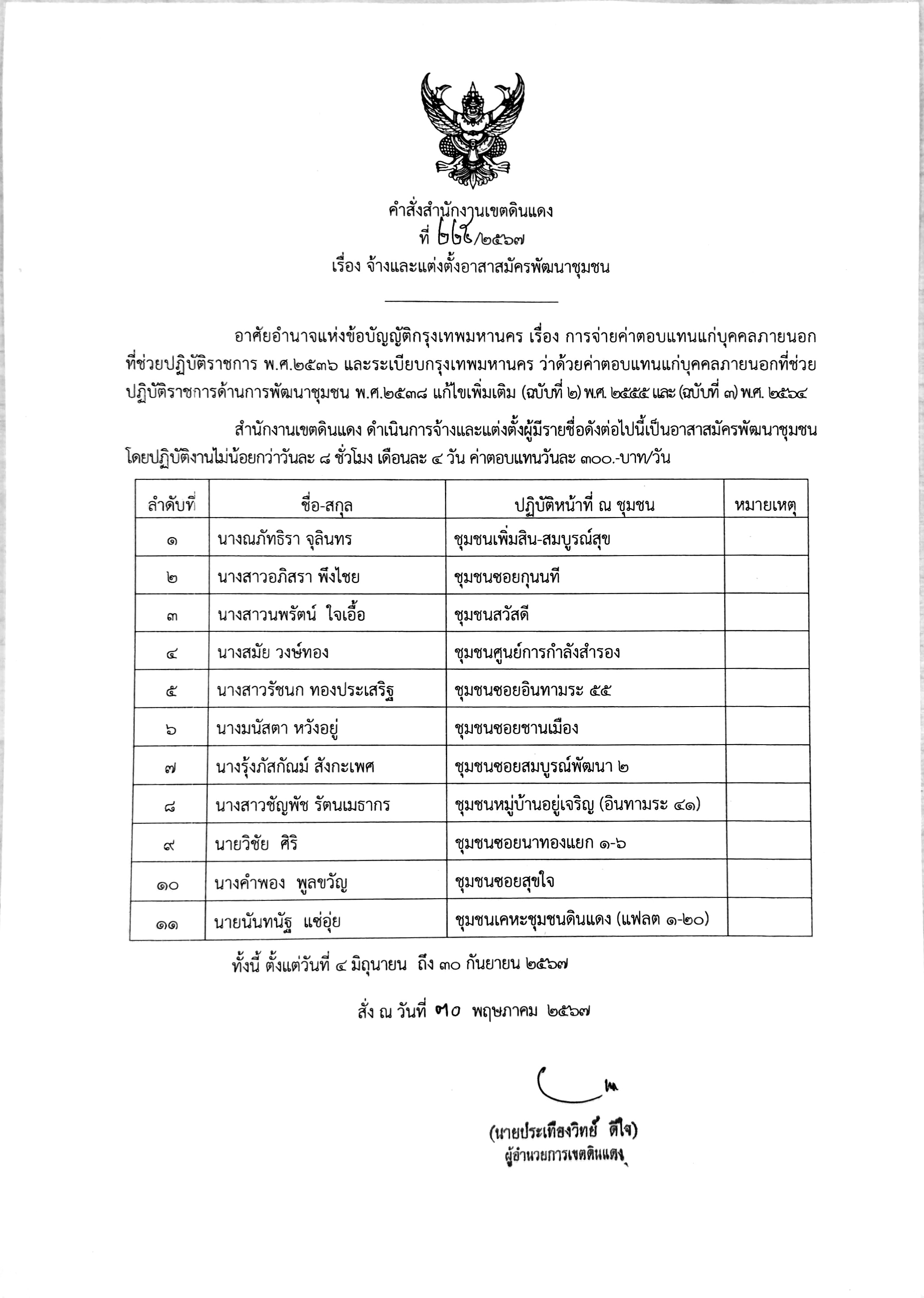 04-06-20240.00ดำเนินการจ้างและแต่งตั้งอาสาสมัครพัฒนาชุมชน เพิ่มอีก 11 คน/ชุมชน ตามคำสั่งสำนักงานเขตดินแดงที่ 225/2567 ลว. 30 พ.ค. 2567 โดยจะเริ่มปฏิบัติหน้าที่ ตั้งแต่วันที่ 4 มิ.ย. 2567 ซึ่งจะทำให้สำนักงานเขตดินแดง มี อสท. พร้อมปฏิบัติหน้าที่ รวมเป็น 14 คน/ชุมชน