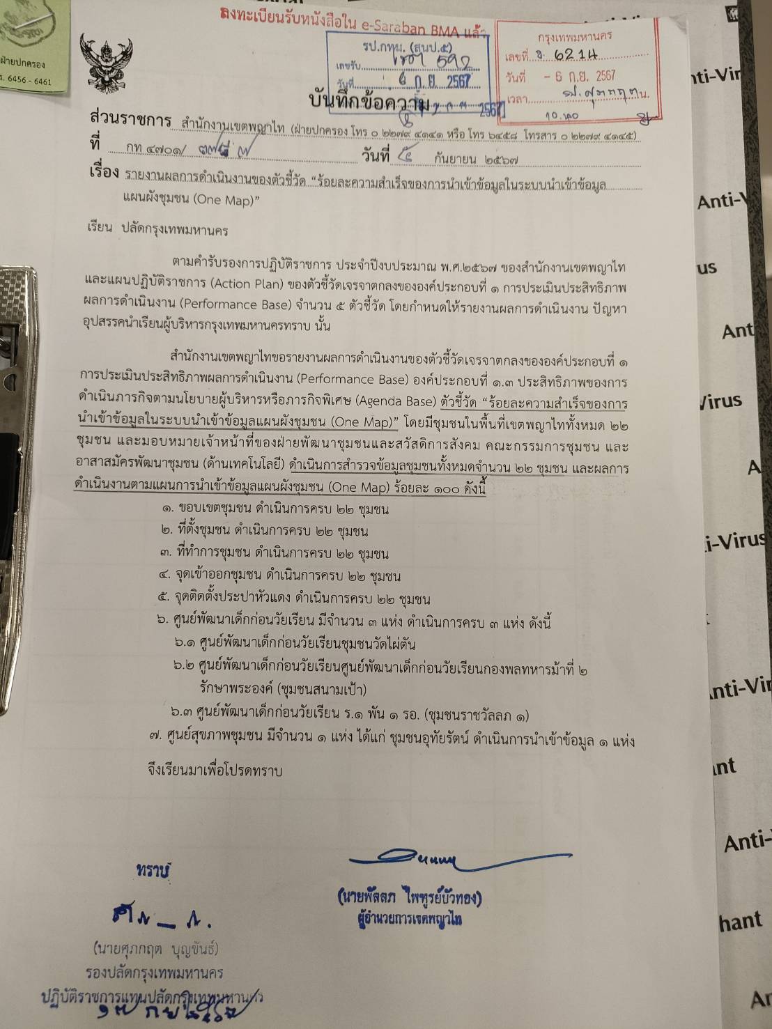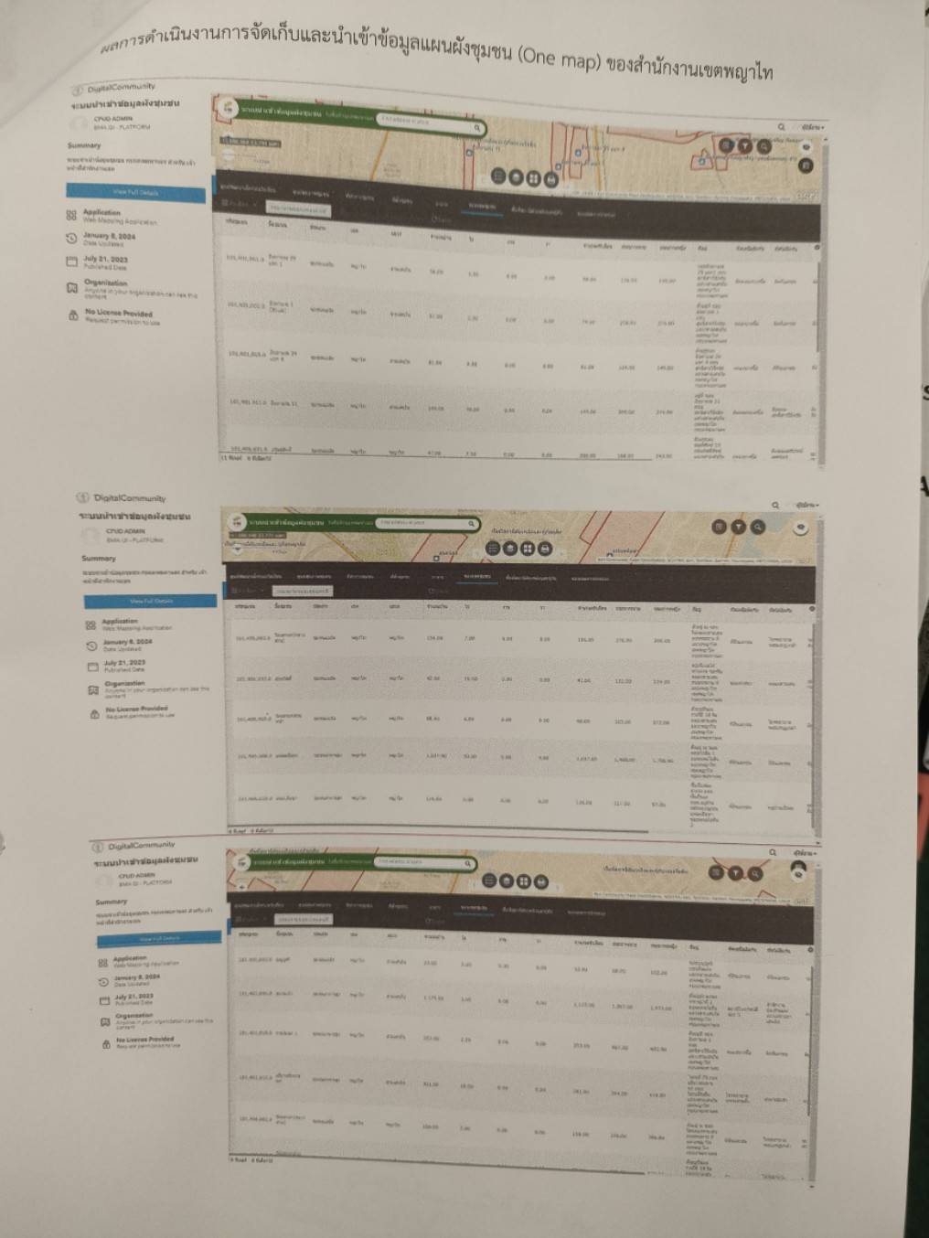 09-04-20240.00ดำเนินการสำรวจและนำเข้าข้อมูลในระบบนำเข้าข้อมูลแผนผังชุมชน (One Map) ดังนี้ 1. ขอบเขตชุมชน ดำเนินการครบ 22 ชุมชน 2. ที่ตั้งชุมชน ดำเนินการครบ 22 ชุมชน 3. ที่ทำการชุมชน ดำเนินการครบ 22 ชุมชน 4. จุดเข้าออกชุมชน ดำเนินการครบ 22 ชุมชน 5. จุดติดตั้งประปาหัวแดง ดำเนินการแล้ว 18 ชุมชน 6. ศูนย์พัฒนาเด็กก่อนวัยเรียนดำเนินการครบ 3 แห่ง 7. ศูนย์สุขภาพชุมชน ดำเนินการนำเข้าข้อมูล 1 ชุมชน