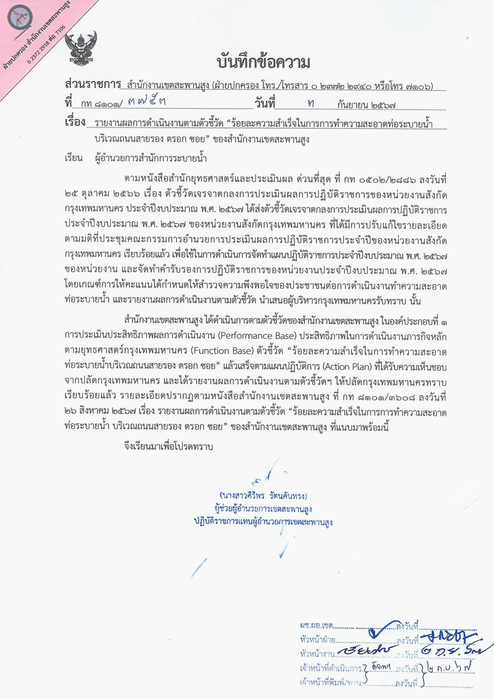 6 | รายงานผลการทำความสะอาดท่อระบายน้ำ ให้ผู้บริหารกรุงเทพมหานครทราบ | 10.00 | 01-09-2424 | 30-09-2424 |