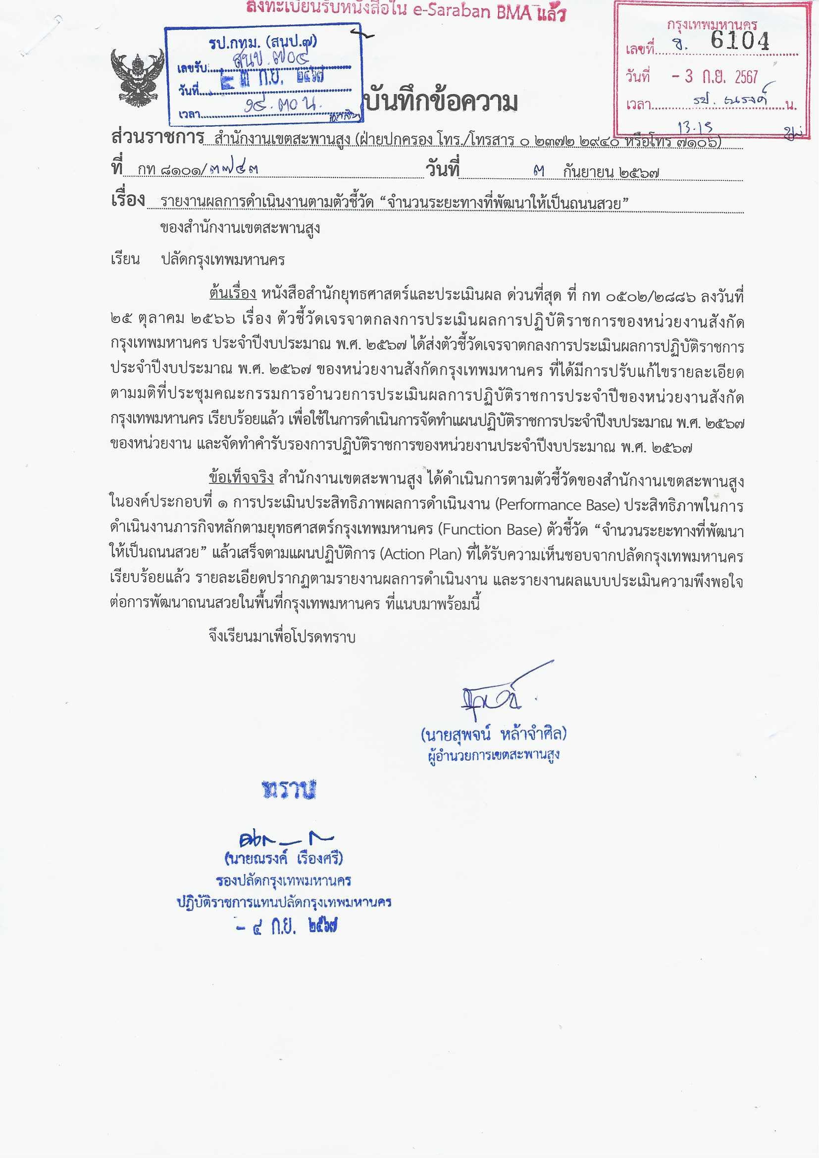 | 4 | รายงานผลการดำเนินงาน ปัญหา อุปสรรคในการดำเนินงานให้ผู้บริหารกรุงเทพมหานครทราบ | 5.00 | 01-09-2024 | 30-09-2024 |