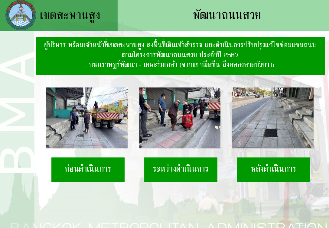 ![]() | - | พัฒนาถนนสวย | 0.00 | 100.00 | สำนักงานเขตสะพานสูง | ฝ่ายปกครอง |