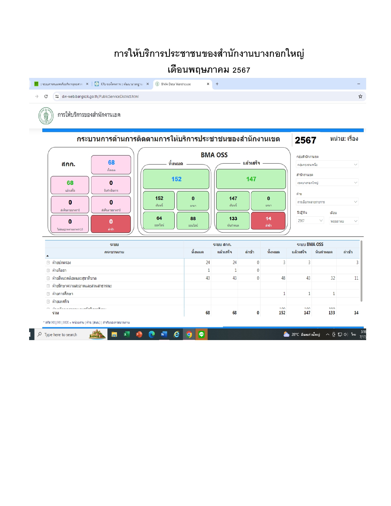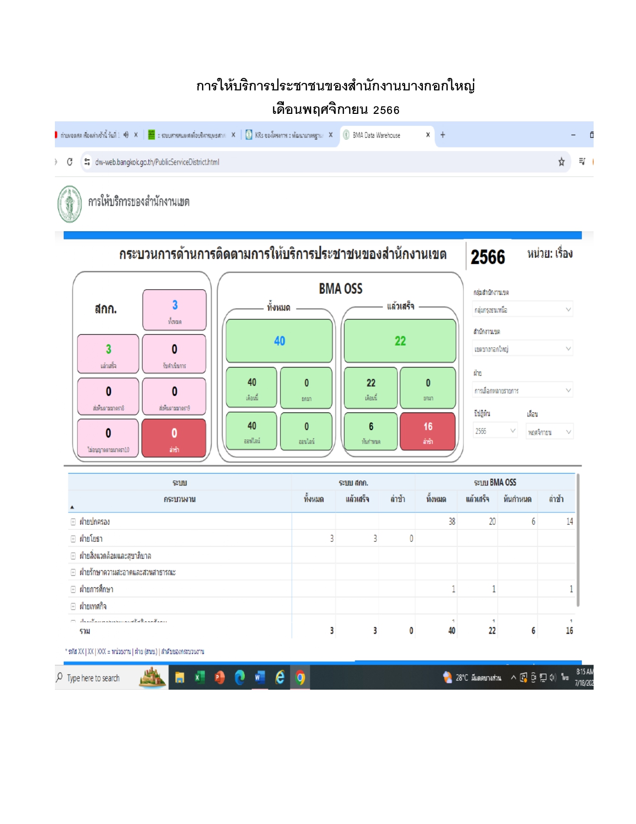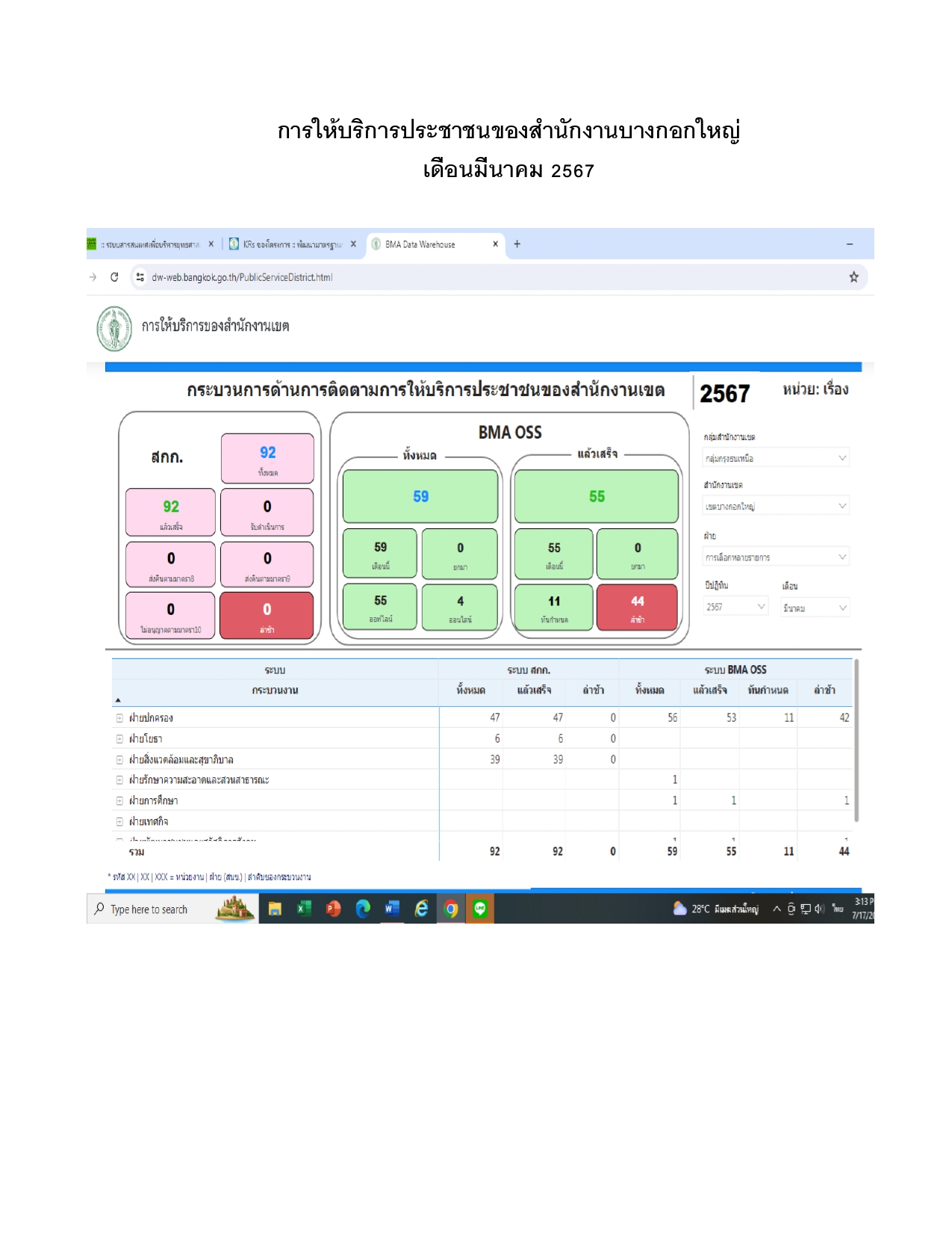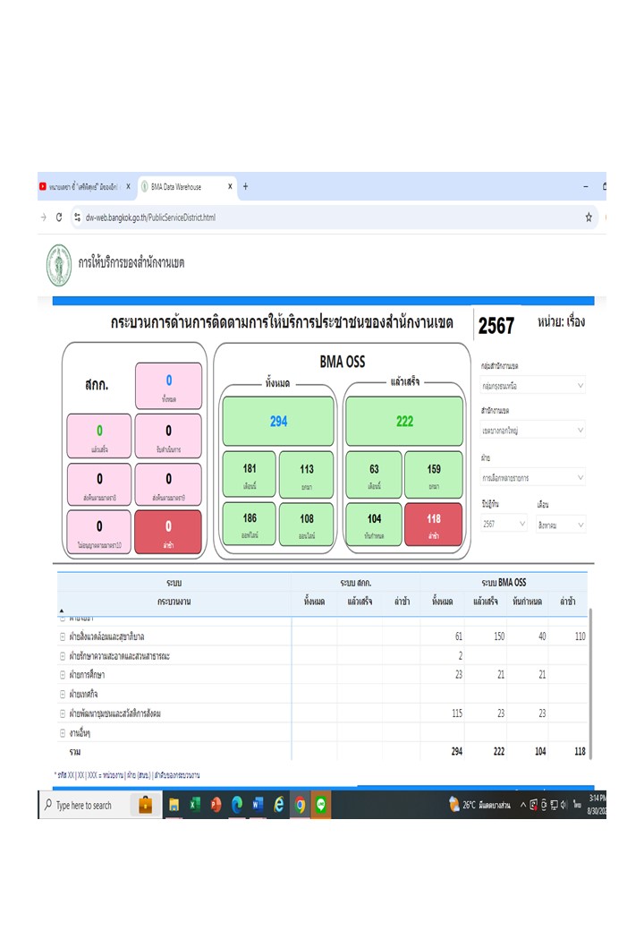 ![]() | 30-08-2024 | 5.00 | การให้บริการประชาชนของสำนักงานเขตบางกอกใหญ่ เดือนสิงหาคม 67 จำนวนเรื่องท้ังหมด 294 เรื่อง ดำเนินการแล้วเสร็จ 222 เรื่อง ทันกำหนด 104 เรื่อง ล่าช้า 118 เรื่อง ผ่านระบบออนไลน์ 186 เรื่อง ออฟไลน์ 108 เรื่อง แบ่งเป็นฝ่ายปกครอง 93 เรื่อง แล้วเสร็จ 28 เรื่อง ทันกำหนด 20 เรื่อง ล่าช้า 8 เรื่อง ฝ่ายสิ่งแวดล้อมฯ 61 เรื่อง แล้วเสร็จ 150 เรื่อง ทันกำหนด 40 เรื่อง ล่าช้า 110 เรื่อง ฝ่ายรักษาความสะอาดฯ 2 เรื่อง แล้วเสร็จ 0 เรื่อง ทันกำหนด 0 เรื่อง ล่าช้า 0 เรื่อง ฝ่ายการศึกษา 23 เรื่อง แล้วเสร็จ 21 เรื่อง ทันกำหนด 21 เรื่องล่าช้า 0 เรื่อง และพัฒนาชุมชนฯ 115 เรื่อง แล้วเสร็จ 23 เรื่อง ทันกำหนด 23 เรื่อง | ||
