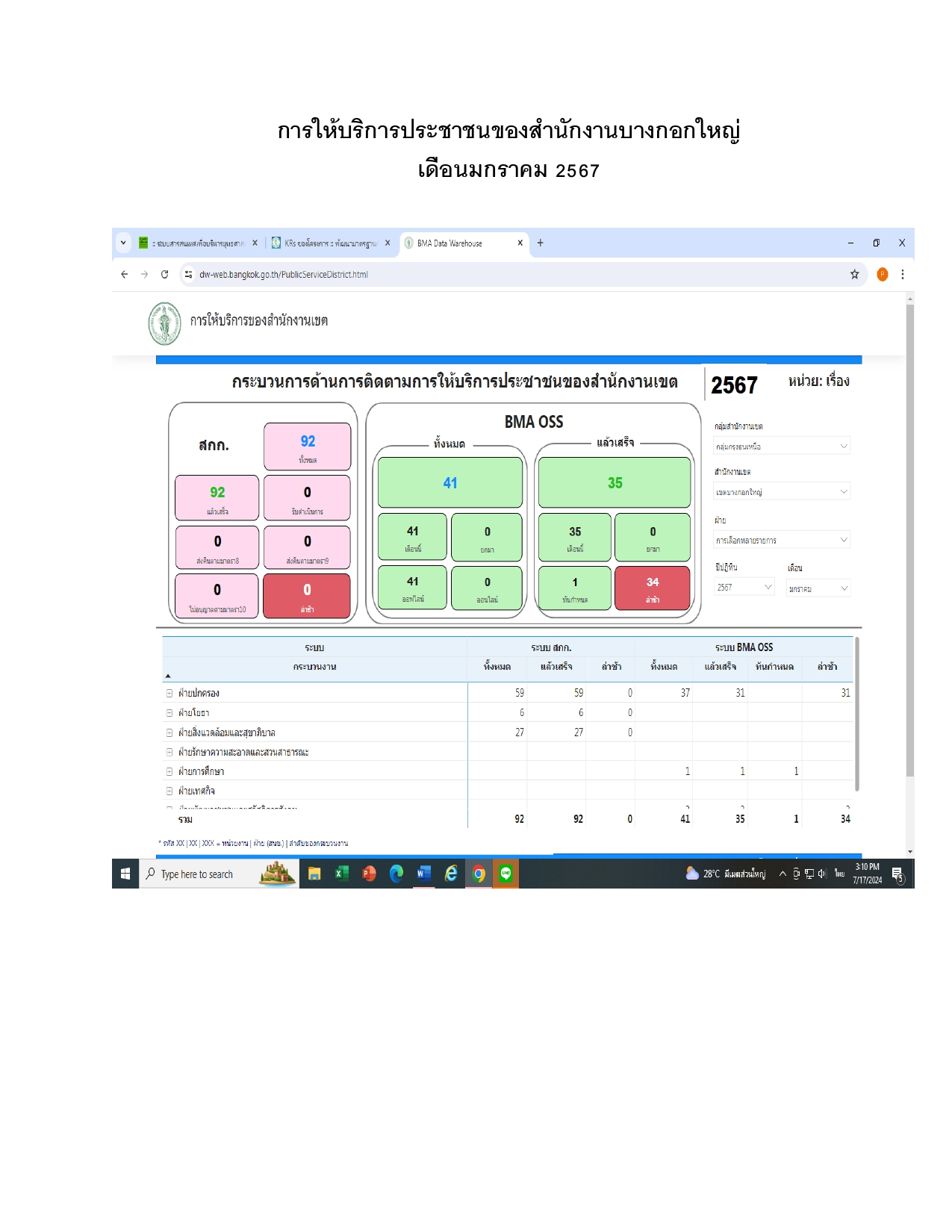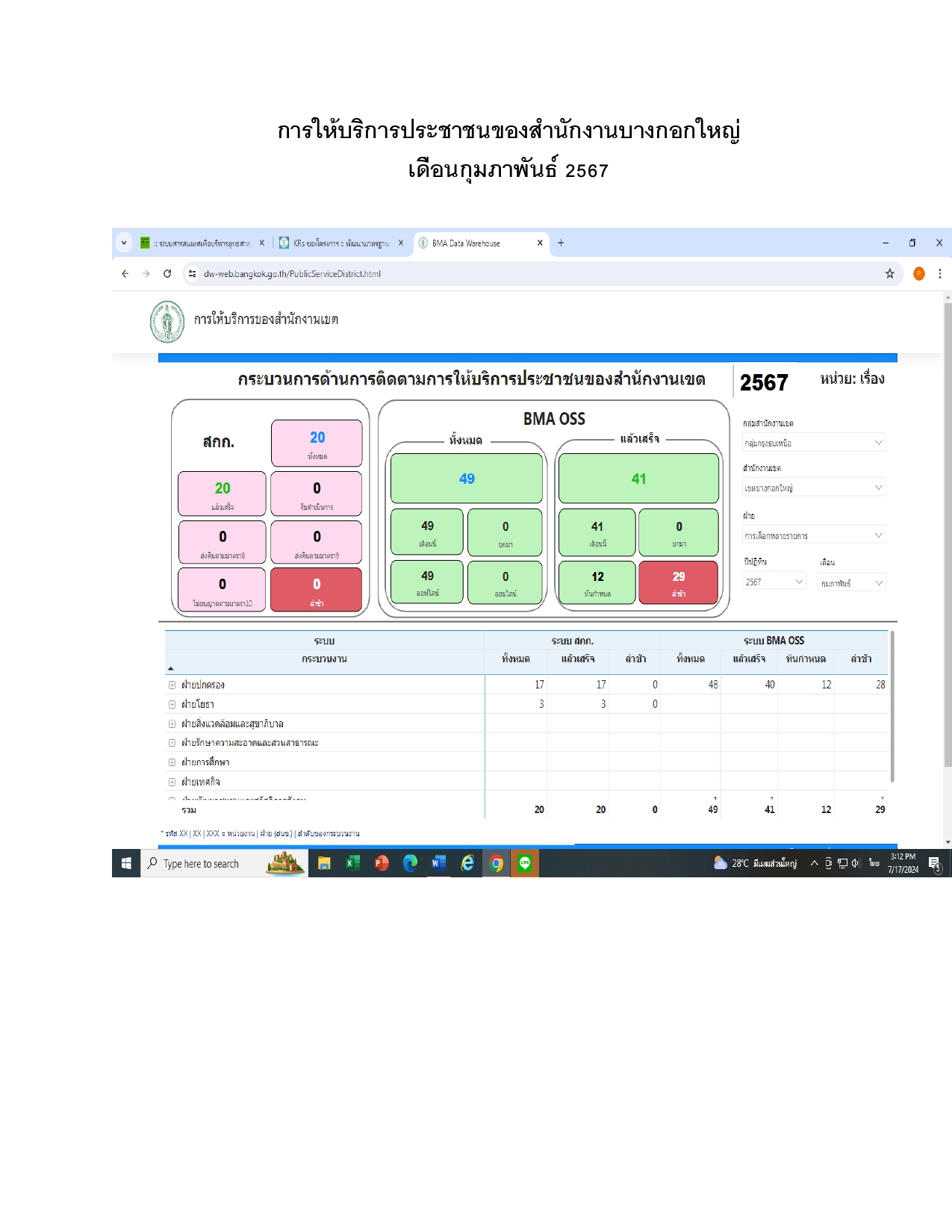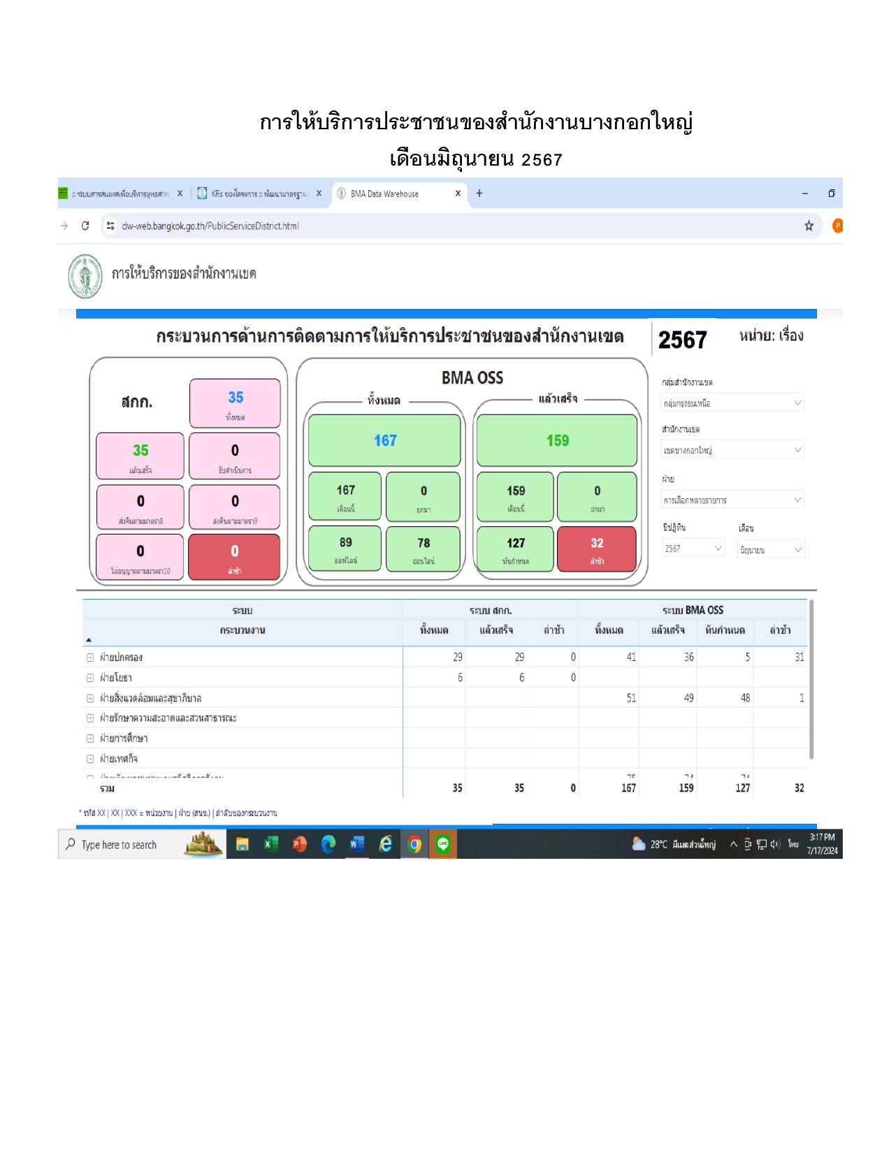 ![]() | 30-08-2024 | 5.00 | การให้บริการประชาชนของสำนักงานเขตบางกอกใหญ่ เดือนสิงหาคม 67 จำนวนเรื่องท้ังหมด 294 เรื่อง ดำเนินการแล้วเสร็จ 222 เรื่อง ทันกำหนด 104 เรื่อง ล่าช้า 118 เรื่อง ผ่านระบบออนไลน์ 186 เรื่อง ออฟไลน์ 108 เรื่อง แบ่งเป็นฝ่ายปกครอง 93 เรื่อง แล้วเสร็จ 28 เรื่อง ทันกำหนด 20 เรื่อง ล่าช้า 8 เรื่อง ฝ่ายสิ่งแวดล้อมฯ 61 เรื่อง แล้วเสร็จ 150 เรื่อง ทันกำหนด 40 เรื่อง ล่าช้า 110 เรื่อง ฝ่ายรักษาความสะอาดฯ 2 เรื่อง แล้วเสร็จ 0 เรื่อง ทันกำหนด 0 เรื่อง ล่าช้า 0 เรื่อง ฝ่ายการศึกษา 23 เรื่อง แล้วเสร็จ 21 เรื่อง ทันกำหนด 21 เรื่องล่าช้า 0 เรื่อง และพัฒนาชุมชนฯ 115 เรื่อง แล้วเสร็จ 23 เรื่อง ทันกำหนด 23 เรื่อง | ||