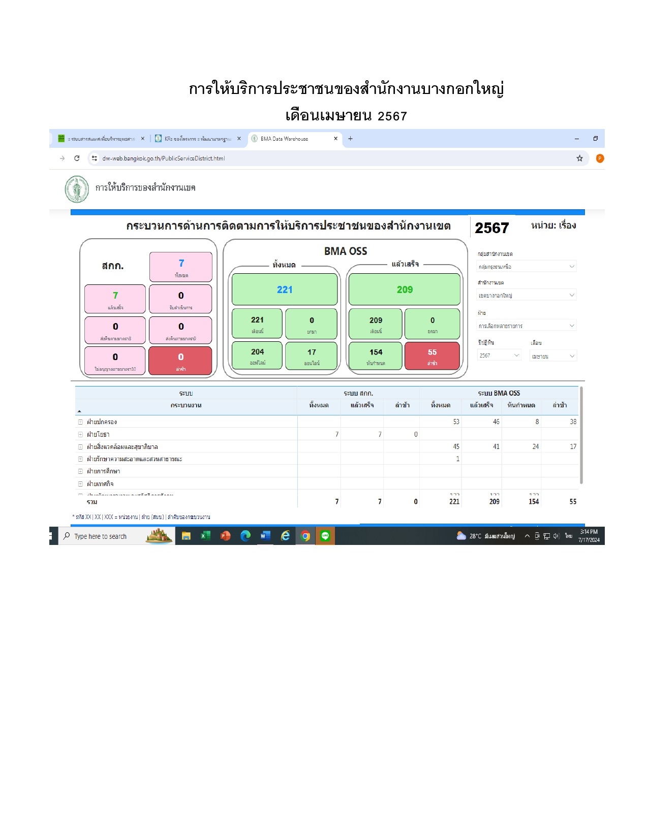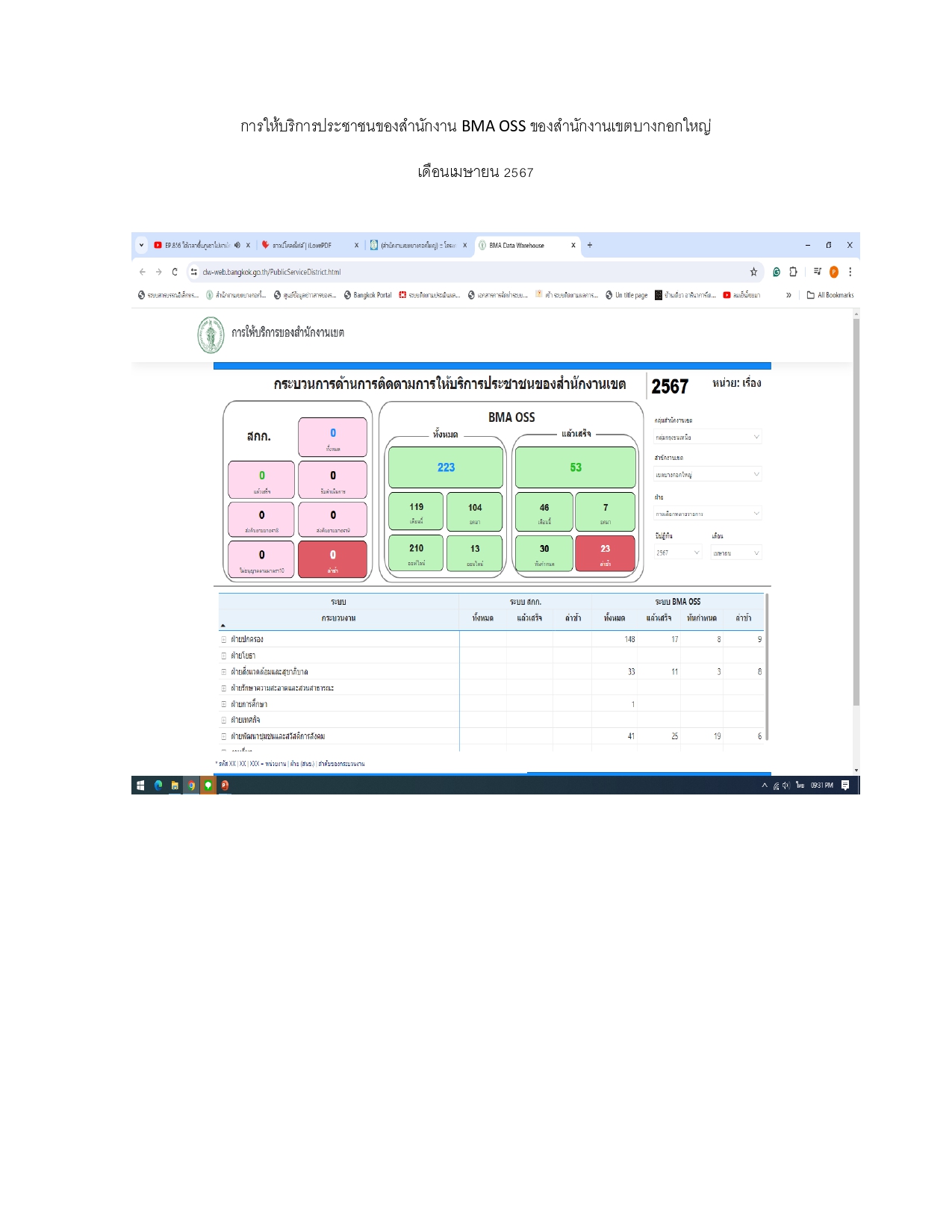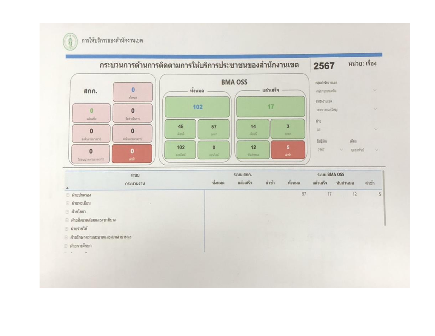![]() | 17-07-2024 | 100.00 | เดือนเม.ย. 67จำนวนผู้รับบริการผ่านระบบศูนย์รับคําขออนุญาตของกรุงเทพมหานคร(BMA OSS) 5 คำขอ - ฝ่ายปกครอง 4 คำขอ - ฝ่ายรักษาความสะอาดฯ 1 คำขอ • จำนวนผู้รับบริการของสำนักงานเขต ทั้งหมด (ทั้ง Online และ Offline) 233 คำขอ • คิดเป็นร้อยละ 2.15 | ||
