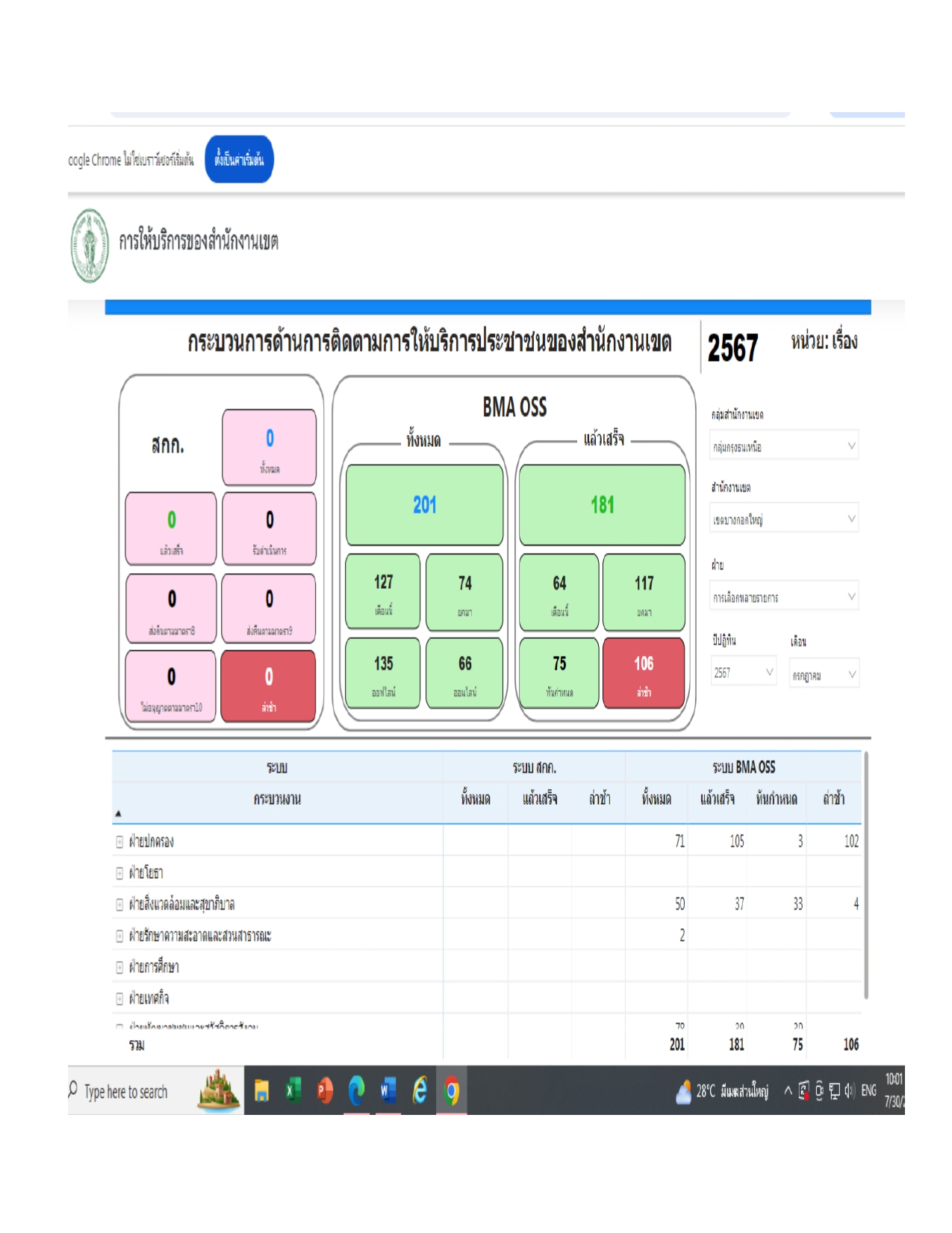 ![]() | 30-08-2024 | 5.00 | การให้บริการประชาชนของสำนักงานเขตบางกอกใหญ่ เดือนสิงหาคม 67 จำนวนเรื่องท้ังหมด 294 เรื่อง ดำเนินการแล้วเสร็จ 222 เรื่อง ทันกำหนด 104 เรื่อง ล่าช้า 118 เรื่อง ผ่านระบบออนไลน์ 186 เรื่อง ออฟไลน์ 108 เรื่อง แบ่งเป็นฝ่ายปกครอง 93 เรื่อง แล้วเสร็จ 28 เรื่อง ทันกำหนด 20 เรื่อง ล่าช้า 8 เรื่อง ฝ่ายสิ่งแวดล้อมฯ 61 เรื่อง แล้วเสร็จ 150 เรื่อง ทันกำหนด 40 เรื่อง ล่าช้า 110 เรื่อง ฝ่ายรักษาความสะอาดฯ 2 เรื่อง แล้วเสร็จ 0 เรื่อง ทันกำหนด 0 เรื่อง ล่าช้า 0 เรื่อง ฝ่ายการศึกษา 23 เรื่อง แล้วเสร็จ 21 เรื่อง ทันกำหนด 21 เรื่องล่าช้า 0 เรื่อง และพัฒนาชุมชนฯ 115 เรื่อง แล้วเสร็จ 23 เรื่อง ทันกำหนด 23 เรื่อง |