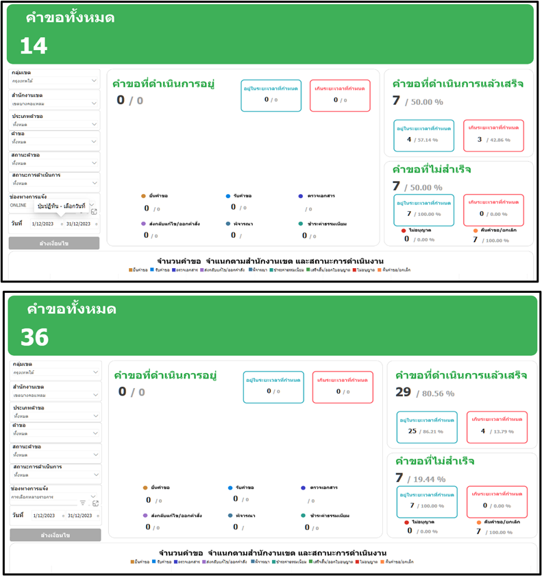 25-12-202338.89เดือนธันวาคม 2566 มีประชาชนยื่นคำขอผ่านทาง online จำนวน 14 ราย คำขอทั้งหมด (online และ onsite) จำนวน 36 ราย