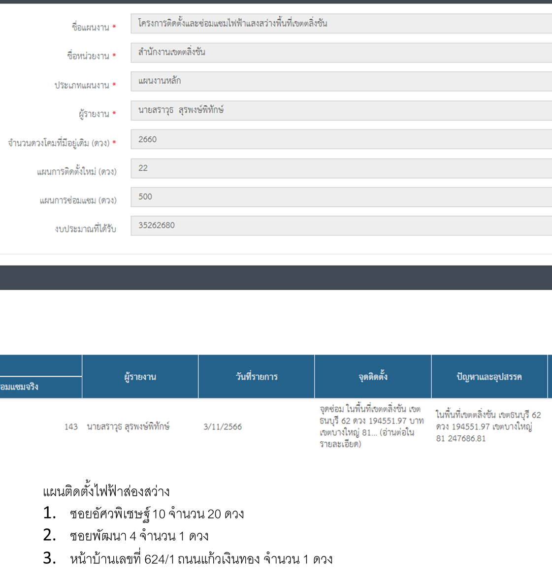 3. การลงข้อมูลแผนติดตั้ง/ซ่อมไฟฟ้าส่องสว่างในระบบของสำนักการโยธา