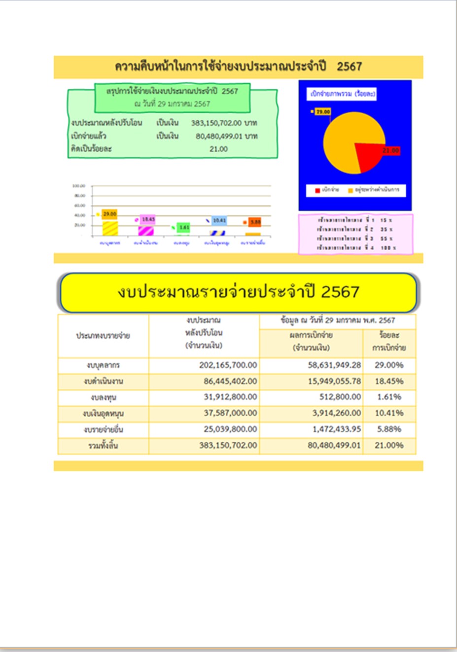 ![]() | 28-05-2024 | 5.40 | ณ วันที่ 28/05/2567 งบประมาณประจำปี พ.ศ. 2567 หลังปรับโอน 382,484,302 บาท เบิกจ่าย 172,287,036.97 บาท คิดเป็นร้อยละ 45.04 % (มีการประชุมติดตามงบประมาณ) | ||