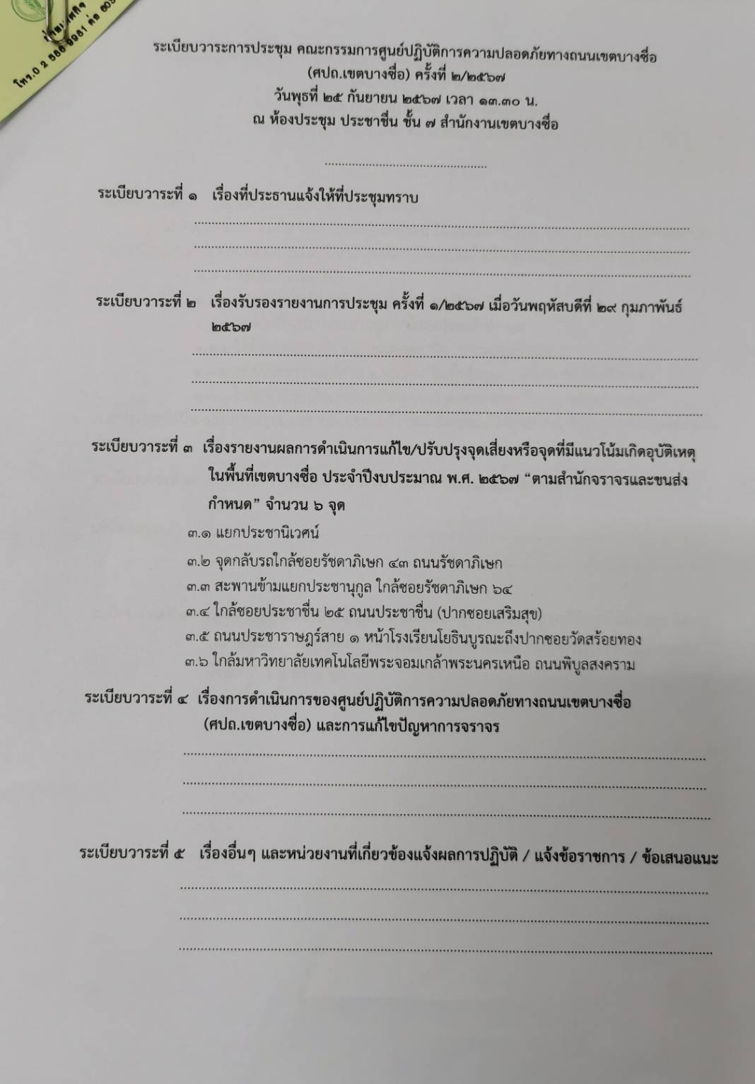 ![]() | 25-09-2024 | 0.00 | ดำเนินการจัดประชุม รายงานผลการดำเนินการแก้ไข/ปรับปรุงจุดเสี่ยงหรือจุดที่มีแนวโน้มเกิดอุบัติเหตุในพื้นที่เขตบางซื่อ วันพุธ 25 กันยายน 2567 | ||